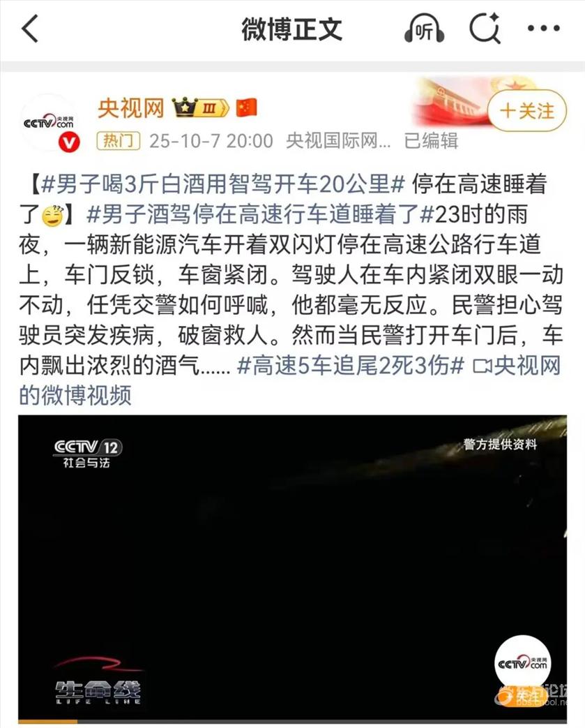 据央视网官方微博10月7日晚上8时许报道,23时的雨夜,一辆新能源汽车开着双闪灯停在浙江杭州的一条高速公路行车道上,车门反锁,车窗紧闭。驾驶人在车内紧闭双眼一动不动,任凭交警如何呼喊,他都毫无反应。民警担心驾驶员突发疾病,破窗救人。然而当民警打开车门后,车内飘出浓烈的酒气。男子告诉交警,他连续喝了两场酒,一共约3斤白酒。此事引起网友热议。 微博截图10月8日极目新闻记者注意到,此事发布于央视《社会与法》栏目。视频中称,5月31日晚上11时13分许,浙江杭州高速公路交警通过公共监控查询时发现,在G4012溧阳—宁德高速杭州方向淡竹收费站附近,一辆小车停于高速公路主线车道。警力到达现场后,在车前透过车窗看到驾驶位上有一名男子靠在座椅上一动不动。打开车门的一瞬间,民警就闻到了浓郁的酒气。 央视视频截图据民警调查,33岁的驾驶员姜某当晚喝了两场酒,分别在家及友人聚餐时饮用了数杯白酒。饮酒后,他计划从杭州市淳安县前往建德市的岳母家,并打算试试他新购买车辆的智能驾驶水平。在酒精影响下,他心存侥幸,误以为自己设置自动驾驶即便被交警拦查,他也能辩解说自己并未驾驶,而是车辆自行行驶。然而,在返回途中,他因酒后困倦而慢慢失去意识后入睡,双手脱离了方向盘,激活了车辆的安全机制,导致车辆逐渐减速并最终停下。 极目新闻记者搜索发现,今年7月23日,在国务院新闻办公室举行的新闻发布会上,公安部交通管理局局长王强表示,目前我国市场上销售的汽车搭载的“智驾”系统都不具备“自动驾驶”功能,都还暂时停留在辅助驾驶阶段,车辆还是需要人来操控,驾驶人才是最终的责任主体。如果驾驶人在驾驶车辆的时候“脱手脱眼”,不仅存在严重的交通安全风险,一旦出事,还可能面临民事赔偿、行政处罚和刑事追责三重法律风险。 央视视频截图浙江省杭州市公安局高速公路交通警察支队七大队副大队长吴佩锋在接受央视采访时表示,“智能驾驶”系统是为驾驶提供辅助作用的,不能替代人成为驾驶主体,所以像在车里睡觉、长时间玩手机等这种“脱手脱眼”的行为是绝对不可取的。 那么有人会问,酒后使用“智能驾驶”还算酒驾、醉驾吗?吴佩锋表示,答案是肯定的,因为无论是否开启辅助驾驶功能,驾驶员都是车辆的实际操控者和责任主体,只要驾驶员饮酒后在车内启动车辆并行驶,就符合酒驾、醉驾的认定条件。 “经过现场呼气式酒精含量检测,驾驶人姜某体内酒精含量为182毫克/100毫升。后经抽血鉴定,姜某血液内酒精含量为205毫克/100毫升,属于醉酒驾驶机动车,构成危险驾驶罪。”吴佩锋透露,姜某被淳安县人民法院判处拘役一个月,并处罚金2000元。 浙江省杭州市公安局高速公路交通警察支队辅警谢家伟在接受央视采访时称,给驾驶带有辅助功能车辆的驾驶员提个醒,目前所有车辆的“智驾”功能本质上都还是智能辅助驾驶,所以即便开启了“智驾”功能,驾驶员也必须全程集中注意力,唯有把方向盘握在自己手中,时刻保持对驾驶车辆的掌控,才是安全的根本。 |
