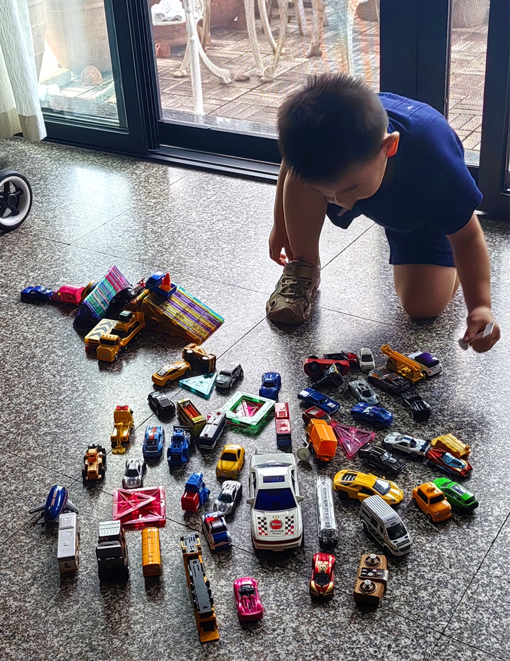 宝宝生于2022年1月,今年虚岁4岁了。宝宝拥有很多很多小汽车,具体的数字不详,至少在100部以上。有叔叔、阿姨送来的,更多的是爸爸、妈妈买来的。车型多种多样,很少有重复。宝宝很喜欢这些小汽车,可以玩上一个多钟头还不肯息手。