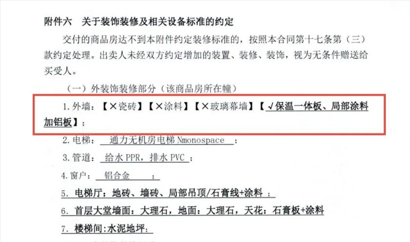 三里江印府商品房买卖合同中关于外墙材料的说明 同时,合同第十七条第二款明确,金属面板保温装饰板属于其他质量问题,建设单位应当按照合同约定及时更换、维修。