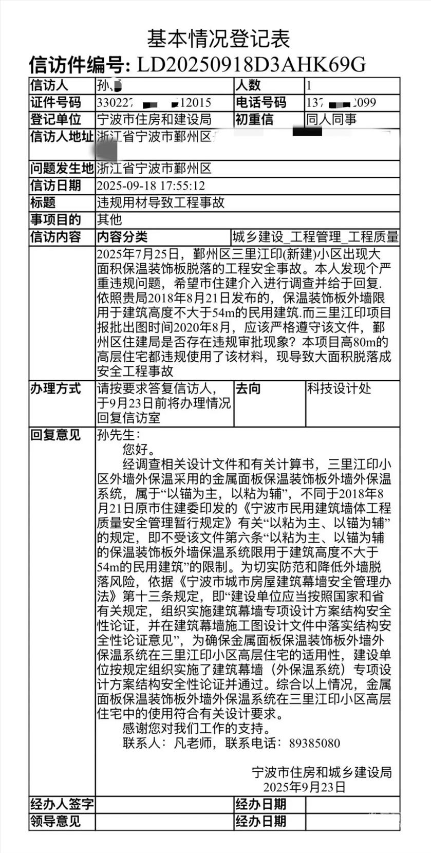 近日,位于宁波老江东核心区、中山东路南侧的三里江印府(潜龙,下同)因外立面维修问题引发社会关注。 今年8月上旬,三里江印府被媒体报道“外立面”在7月底台风天中脱落。据市民反映,脱落部位至今未维修。 对此,该项目开发商宁波招鄞置业有限公司(以下简称“招鄞置业”)方面正式作出如下回应: 事发后公司高度重视,第一时间采取应急措施,对隐患区域进行围挡和周边加固,并组织专业技术团队对所有楼栋外立面锚固情况进行排查。 经初步判断,此次脱落系个别锚栓漏打叠加极端天气所致。 项目负责人已于八月初制定维修方案,并报送主管部门备案。但部分业主要求“将外立面全部更换为干挂铝板”,以此阻止维修。 我们了解到,业主提出更换外立面的核心原因,是认为项目存在违规建造。但三里江印府原外立面材料为金属面板保温装饰板,其应用严格符合浙江省相关技术规程,并通过专项审图,取得审查合格书,符合合同约定及国家和地方标准。目前制定的维修方案旨在恢复原设计标准,消除安全隐患,保障业主权益。 具体依据如下: 一《浙江省保温装饰一体化板外墙外保温系统应用指南》 2023年浙江省建设厅印发了《浙江省保温装饰一体化板外墙外保温系统应用指南》,其中明确,三里江印府外立面使用的金属面板保温装饰板是保温装饰一体化板的一种类型,其应用须符合浙江省工程建设标准《金属面板保温装饰板外墙外保温系统应用技术规程》DB33/T1230-2020。 在该应用指南中还提到以下两点: