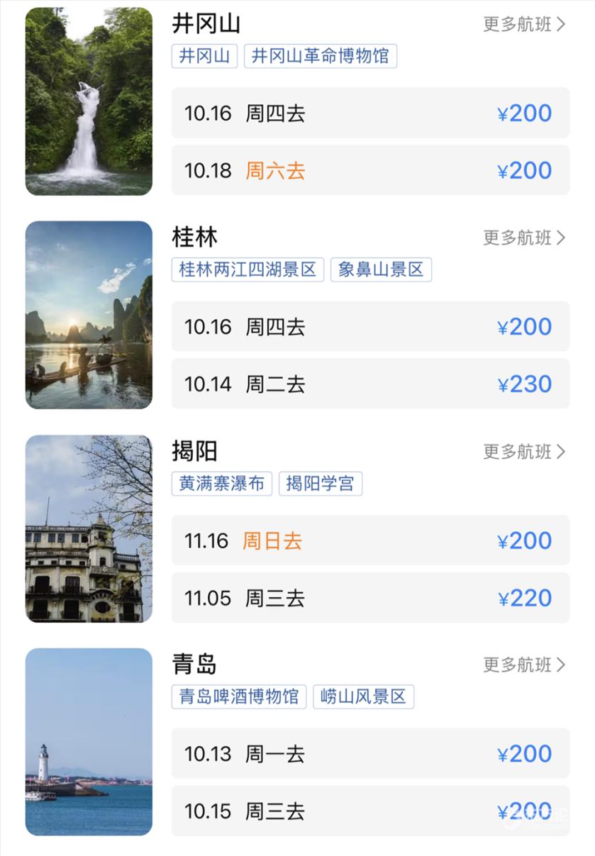国庆中秋假期结束,距离下一个假期,2026年元旦,还有近80天时间。假期里一度炙手可热的机票价格也纷纷开始“大跳水”,宁波栎社国际机场出发的机票不少都低至2折,甚至不少都打出了200元的“地板价”。加上高温即将褪去,国内不少地方都已是秋高气爽的时节,因此如果你有闲暇,非常适合“捡漏”错峰出游。 来看看,从现在到11月底,宁波机场出发的机票价格,能有多便宜: 宁波飞广州,200元 宁波飞十堰,200元 宁波飞威海,200元 宁波飞大连,200元 宁波飞井冈山,200元 宁波飞青岛,200元
