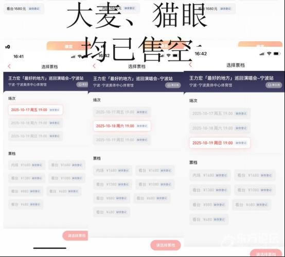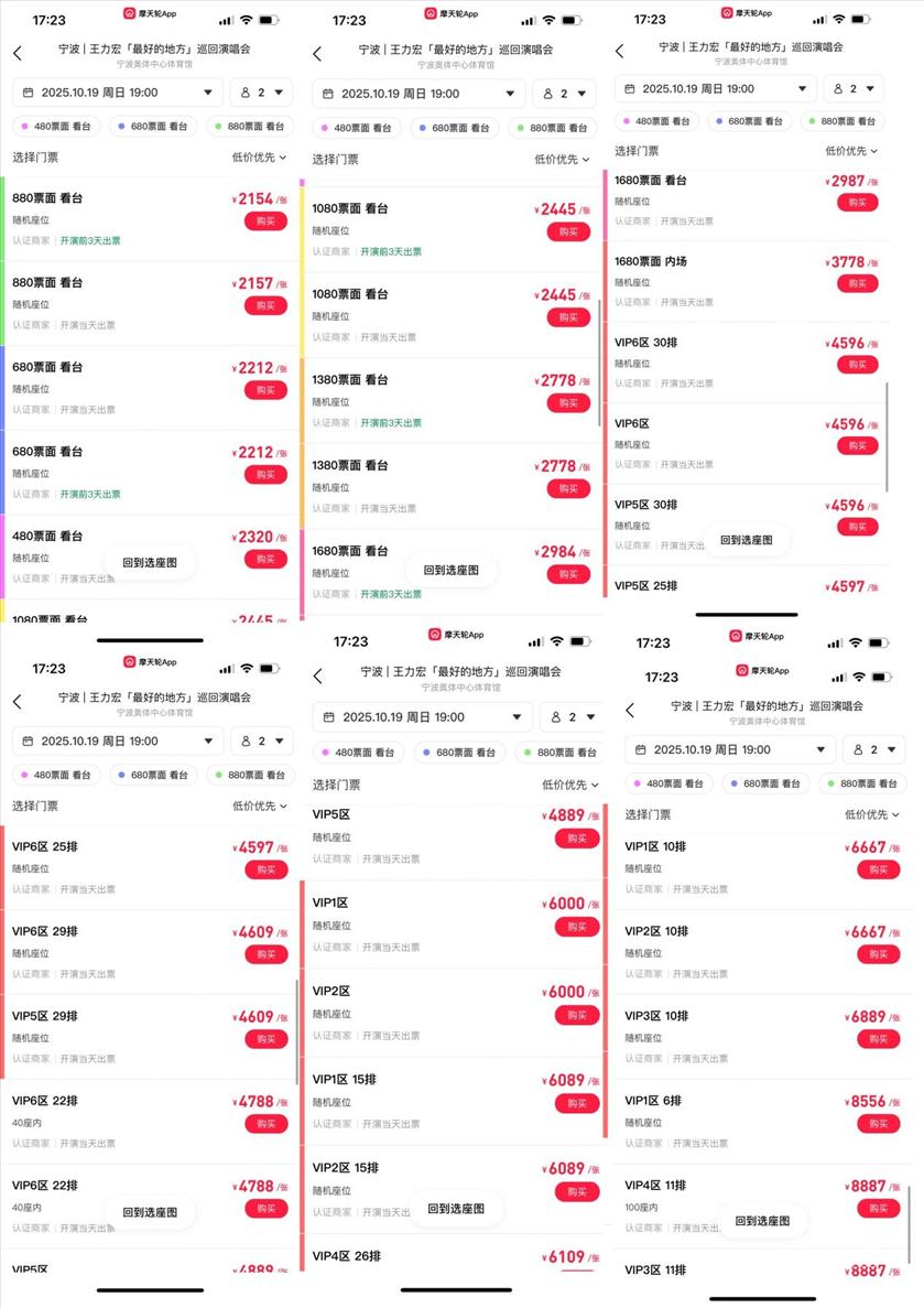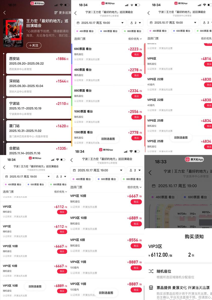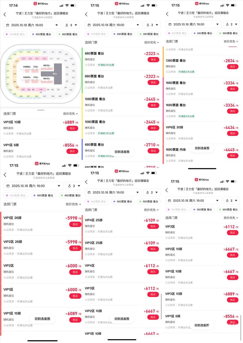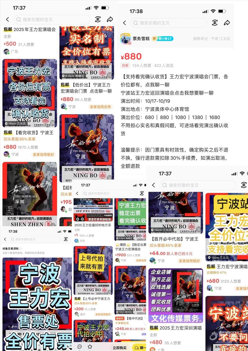 喜欢王力宏好多年,从学生时代MP3循环《大城小爱》到上班通勤听《需要人陪》,盼他来宁波开演唱会盼了多少年?刷到他真的来宁波开演的消息直接激动的不行。结果抢票全是笑话!9月15日预售的时候就做好准备,一进去就是“前方拥挤”变售罄;10月13日的二开定三个闹钟、拉了好多朋友一起抢,也还是一张没抢到!转头刷摩天轮、闲鱼,我直接气到浑身发抖!一搜“宁波王力宏”,满屏全是黄牛的票!680的看台票,张口就敢要2400多,VIP票更是炒到7000块!一些最好的位置连票带服务费甚至到万元以上!17号到19号,三天的票全有!黄牛鼻孔都快翘到天上:“要抓紧,后面还涨”这哪是卖票?这是光天化日之下抢钱! |