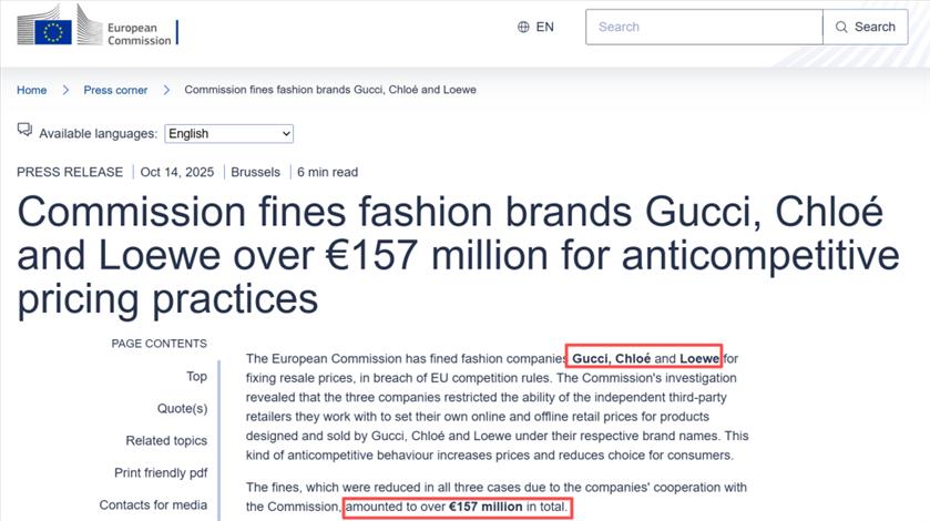 三家知名奢侈品公司,集体被罚! 10月14日,欧盟委员会官网显示,欧盟委员会因古驰(Gucci)、蔻依(Chloé)和罗意威(Loewe)存在反竞争定价行为,对三家公司处以合计超1.57亿欧元罚款。 ![]() 古驰、蔻依和罗意威总部分别位于意大利、法国和西班牙,三家公司均活跃于高端时尚产品的设计、生产和分销领域,包括服装、皮具和各种配饰。 调查显示,这三家时尚公司从事了一种称为“转售价格维持(RPM)”的做法,限制了其线上和实体零售商(均为独立转售商)设定其自身零售价格的能力。侵权行为覆盖了整个欧洲经济区(EEA)领土。 ![]() 具体而言,这三家时尚公司通过对其零售商施加限制来干预其商业策略,力求让零售商采用与其自身直销渠道相同的价格和销售条件。例如,要求零售商不得偏离建议零售价格、最高折扣率以及特定销售时段;在某些情况下,禁止零售商提供任何折扣。 这三家时尚公司的侵权行为均于2023年4月结束,当时欧盟委员会对其经营场所进行了突击检查。欧盟委员会于2024年7月启动了正式程序。三家公司均明确承认事实及其对欧盟反垄断规则的违反,这使得委员会能够根据反垄断合作程序结案。 罚款金额方面,古驰被处罚1.197亿欧元,蔻依被处罚1969万欧元,罗意威被处罚1800.9万欧元。其中,古驰和罗意威的处罚金额均获得50%的减免。欧盟委员会提到,罚款金额的减免反映了每起个案中合作的时间点和价值。 ![]() |