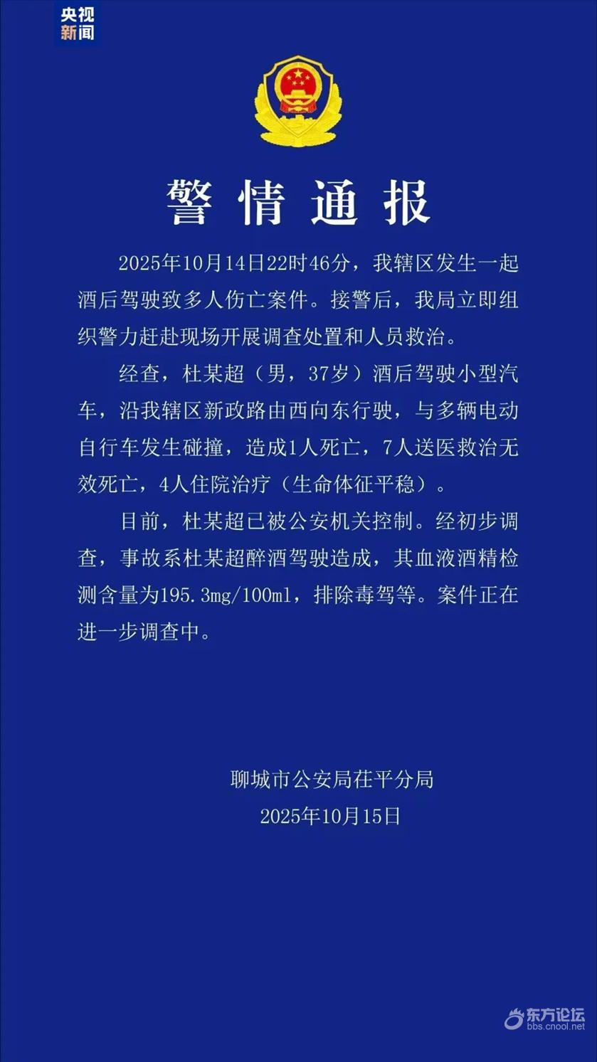 今天,山东聊城公安局茌平分局发布警情通报:10月14日22时46分,辖区发生一起酒后驾驶致多人伤亡案件。经查,杜某超(男,37岁)酒后驾驶小型汽车,沿辖区新政路由西向东行驶,与多辆电动自行车发生碰撞,造成1人死亡,7人送医救治无效死亡,4人住院治疗(生命体征平稳)。