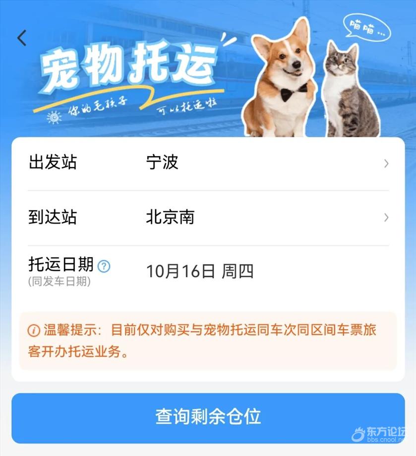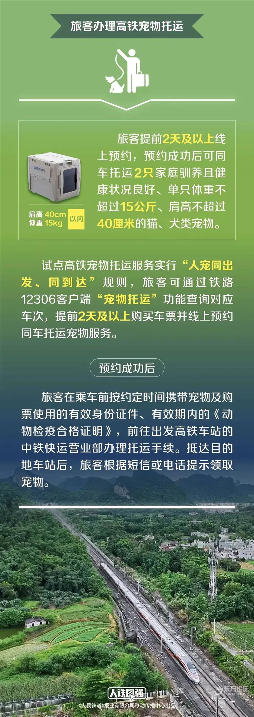 ![]() 10月15日起 铁路部门进一步扩大 高铁宠物托运服务试点范围 新增铁路宁波站等15座车站 旅客可通过 铁路12306APP预约 为符合条件的宠物办理同车托运 据悉,本次新增北京丰台、北京清河、天津西、太原南、呼和浩特东、汉中、烟台、威海、徐州东、合肥南、宁波、福州、厦门北、南宁东和重庆西15座车站。截至目前,办理高铁宠物托运业务的高铁站总数达到40个,高铁列车由38趟增至54趟,具体办理线路和车次可通过铁路12306客户端查询。 宠物在高铁上实行“隔离运输、人宠分开、专人看护”的运输方式。 宠物托运注意事项 一图读懂 ↓↓ ![]() 价格方面,试点高铁宠物托运服务按运输里程梯次计价。目前,宁波到杭州东、南京南的宠物托运费用为360元,宁波到北京南的费用为460元。初期实行7折优惠,同时赠送保额2000元的基础保险。 ![]() 12306宠物托运服务界面 ![]() ![]() 铁路部门自4月8日在京沪高铁部分站点试点高铁宠物托运服务,运行平稳有序,市场反响良好。 铁路部门提示,如需获取高铁宠物托运服务更多信息,旅客朋友可拨打12306和95572客服热线,或在铁路12306APP查询。 |