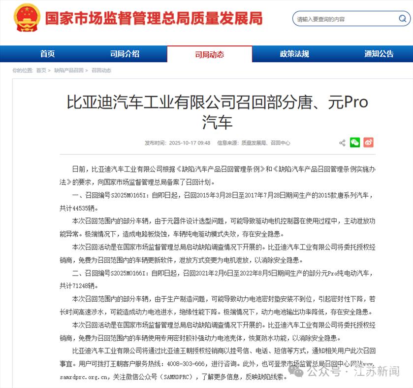 日前,比亚迪汽车工业有限公司根据《缺陷汽车产品召回管理条例》和《缺陷汽车产品召回管理条例实施办法》的要求,向国家市场监督管理总局备案了召回计划。 一、召回编号S2025M0165I:自即日起,召回2015年3月28日至2017年7月28日期间生产的2015款唐系列汽车,共计44535辆。 本次召回范围内的部分车辆,由于元器件设计选型问题,可能导致驱动电机控制器在使用过程中,主动泄放功能异常。极端情况下,造成电路板烧蚀,车辆纯电驱动模式失效,存在安全隐患。 本次召回活动是在国家市场监督管理总局启动缺陷调查情况下开展的。比亚迪汽车工业有限公司将委托授权经销商,免费为召回范围内的车辆更新软件,泄放方式变更为电机泄放,以消除安全隐患。 二、召回编号S2025M0166I:自即日起,召回2021年2月6日至2022年8月5日期间生产的部分元Pro纯电动汽车,共计71248辆。 本次召回范围内的部分车辆,由于生产制造问题,可能导致动力电池密封垫安装不到位,引起密封性下降,若长时间高速涉水,可能造成动力电池进水,绝缘性能下降。极端情况下,动力电池输出功率降低,存在安全隐患。 本次召回活动是在国家市场监督管理总局启动缺陷调查情况下开展的。比亚迪汽车工业有限公司将委托授权经销商,免费为召回范围内的车辆使用专用密封胶补强动力电池壳体,恢复防水功能,以消除安全隐患。 比亚迪汽车工业有限公司将通过比亚迪王朝授权经销商以挂号信、电话、短信等方式,通知相关用户此次召回事宜。用户可拨打王朝客户服务热线:4008-303-666,进行咨询。此外,也可登录市场监管总局召回中心网站www.samrdprc.org.cn,关注微信公众号(SAMRDPRC),了解更多信息,反映缺陷线索。 ![]() |