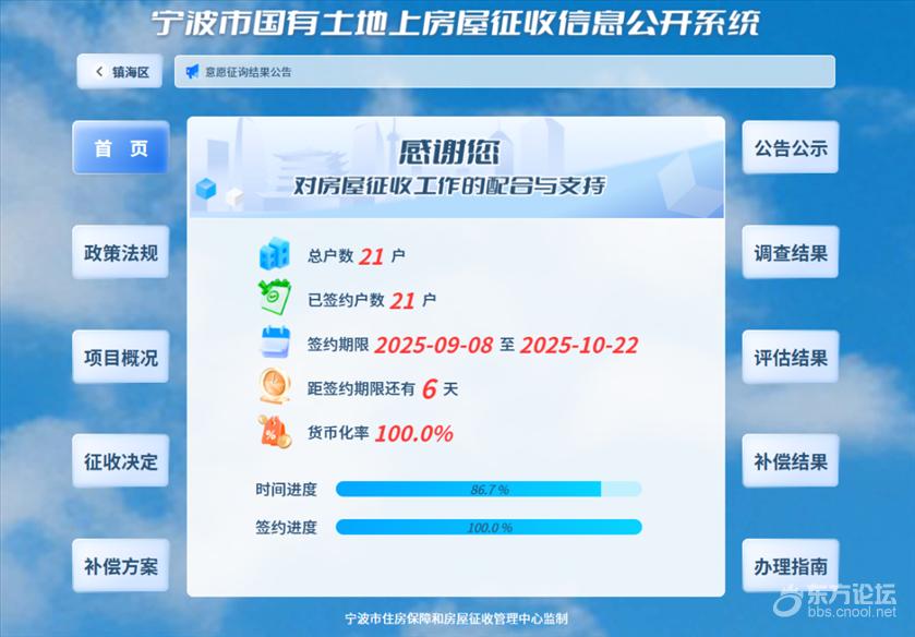 位于镇海澥浦镇的又一拆迁项目——镇海区汇源菜场1号地块项目,于昨日(10月16日)提前完成签约“清零”。 据宁波市国有土地上房屋征收信息公开系统显示,该项目已签约户数21户,签约率100%,货币化率100%,即全部选择货币安置、没有选择拿安置房的。 按房屋征收补偿方案规定,签约率达到80%,补偿协议即告生效。