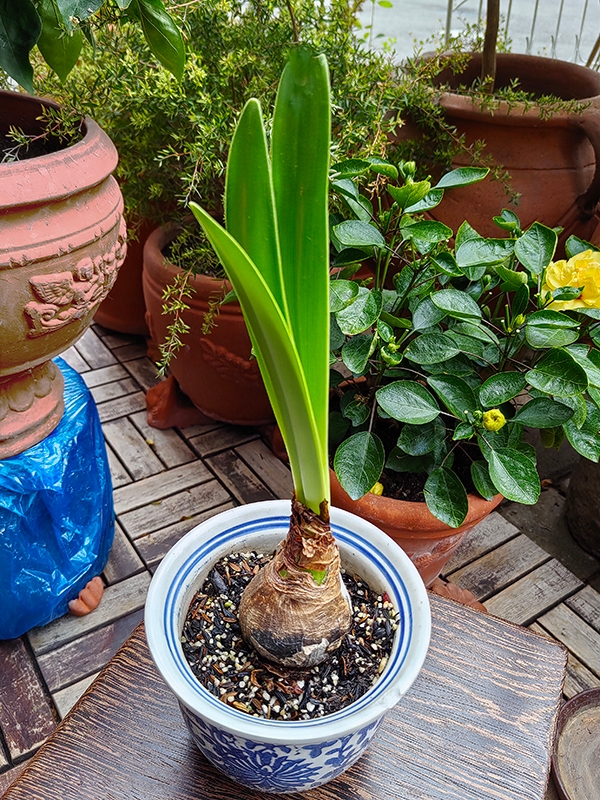 朱顶红的根部是球形的,像似一个大蒜头,种入花盆的时候,只是把下半个种入土中,过了半个月或二十天之后根球长出叶子来了,叶子深绿色,宽带状。接下来在叶子的中间长出圆形的花茎来,花茎的顶端会长出3个(左右)花蕾,过了约5天左右,花蕾就开出了花朵。