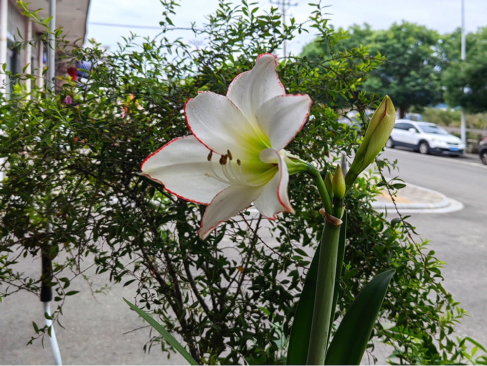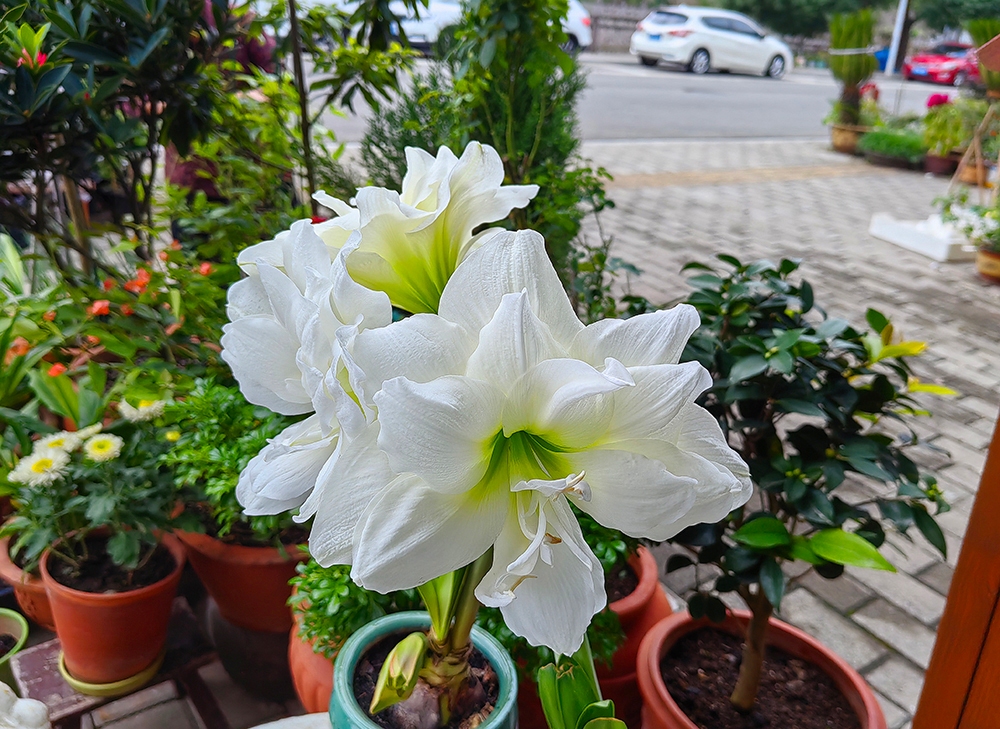 朱顶红的花朵像张开的喇叭状,直径有15厘米以上,有单瓣的也有重瓣的。朱顶红的花并非都是红色的,而有好多种颜色,我看到有大红色的,有粉红色的,有白色的,有白色带红边的,等等。都很美丽。