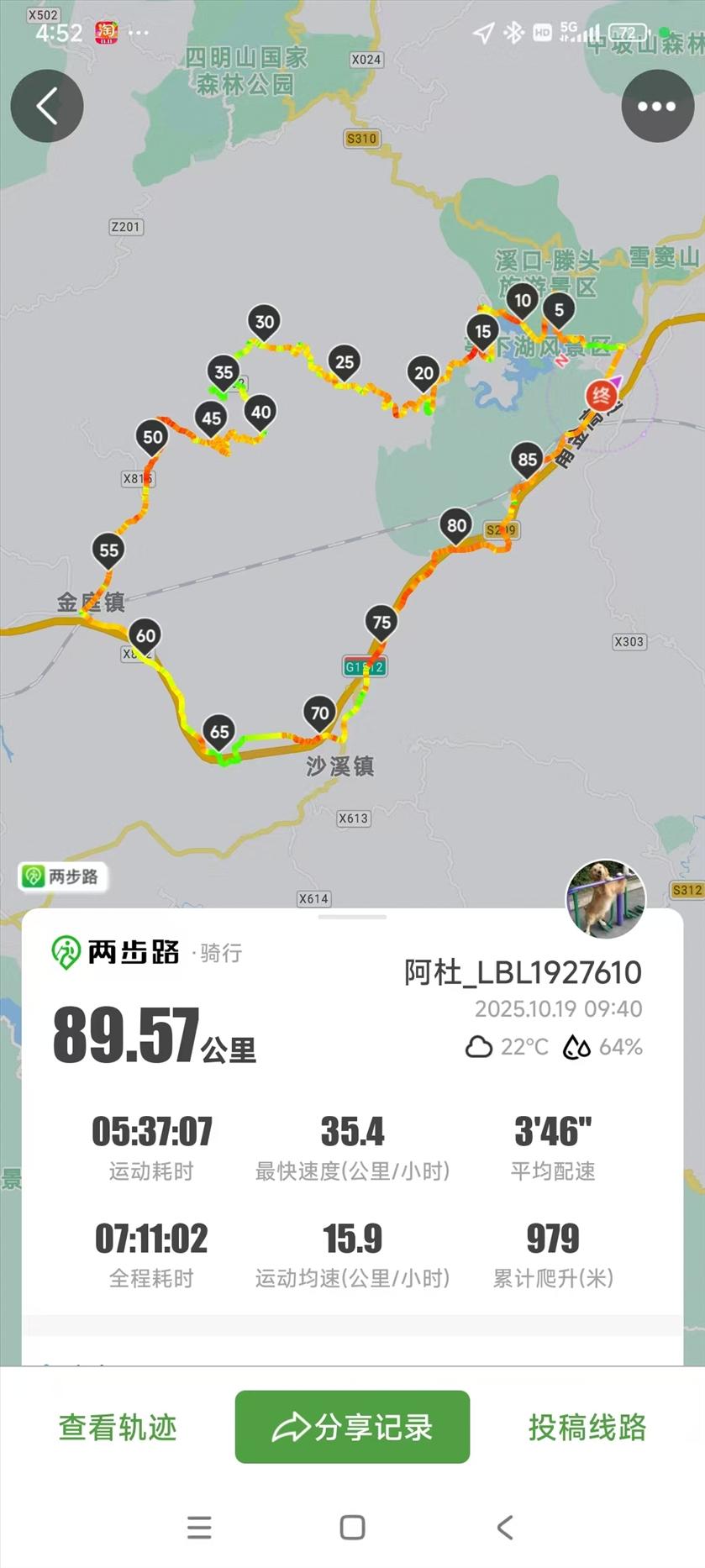 10月19日阴天,气温22度,骑车最佳天气。4+2到奉化康岭村村委会停好车,向东出发,翻过亭下湖大坝,一汪湖水尽收眼底,足足有十个西湖那么大,湖面广阔,波光粼粼,别有一番景象,绕湖十公里欣赏完库区的绿油油大草地和最美最孤独的一棵水杉树,就来到亭下湖林场。稍息片刻,放坡下到夏天的玩水圣地-东坑村,一路逆溪而上,溪水清澈见底,叮咚作响,过溪北村,穿斑竹村,来到了驻岭村狭长的驻岭水库。水库水体晦涩发暗,是不是跟上游流入的一条叫晦溪有关,不得而知。经过蒋介石外婆家的葛竹村后来到明溪村,一路都是柏油路,丝滑骑行,机动车也很少,偶尔碰到几辆,雨后的山中空气香甜的很。在明溪村小超市吃完泡面后就向十公里长的乌龟岭进发,盘山公路在毛竹林中蜿蜒伸展,自行车艰难地往上爬升,呼吸变得急促,踩踏明显变慢,最大的齿比也解救不了我,汗水湿透排汗衫再湿透骑行服,谧静的山谷中能清晰地听到自己的心跳,稳健而有力。头脑中啥也不想,啥也来不及想,埋头踩踏着脚蹬,一圈一圈艰难的往上滚。到了坡顶一座龙王庙豁然立于眼前,很是纳闷龙王怎么会到山上来?这也是奉化与嵊州的交界线。下坡时有一段路是修补过的水泥路,对骑行非常不友好。一路飞驰而下来到桃形李产地-金庭镇,上坡有多难下坡就有多爽。在金庭镇镇上做了些补给,赶快上路跨越甬金高速,穿过成功岭隧道就到以牛肉扬名天下的沙溪镇。时间也到了下午两点多,必须加快进度了。无心拍照沿着三六省道一路平坦顺利回到康岭村。绕了一大圈又回到原点,消耗了七瓶饮料,流了三四斤汗水,但是过程很愉快,身心得到了锻炼。 ![]() ![]() ![]() ![]() ![]() ![]() ![]() ![]() ![]() ![]() ![]()