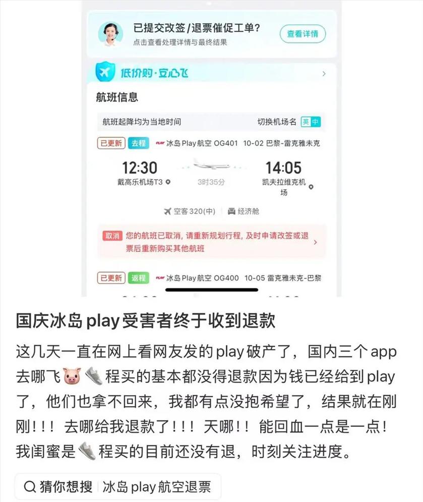 近日,不少消费者在社交平台上发帖求助,称冰岛play航空倒闭导致机票退费难。不少网友称,自己原本的出行计划也因此被迫中止。 “我8月买的票,9月通知订单取消,到现在机票钱还没退给我。”安徽的吴先生便是其中一名受影响的消费者,他称自己多次就此事与购票平台携程App方沟通,但问题始终未能得到解决。 10月20日,红星新闻从多方了解到,目前已有部分平台陆续向消费者退款,但携程客服称因还在跟航司核实中,尚未有更新进展。 ![]() ▲吴先生的订票截图 对此,有律师表示,该事件系跨境消费纠纷,目前法律没有明确强制要求售票平台在航空公司破产时必须先行赔付,平台一般需要在与航司沟通协调后,根据航司的破产处理方案来处理消费者的退款事宜,“如果平台在服务协议中明确约定了在类似情况下会先行赔付,或者其行为符合上述需要承担连带责任的情形,那么平台应当先行赔付消费者的损失。” 冰岛一航空公司突然破产 消费者遭遇机票退费难问题 吴先生告诉红星新闻记者,他原计划在今年年底出国旅游,因其中一段行程涉及冰岛到西班牙,便于8月17日在携程App上提前购买了一张雷克雅维克飞巴塞罗那的机票,价值1551元。等到9月30日时,吴先生却收到携程的短信通知,告知该航班取消。 “当时没有告知取消原因。”吴先生说,在收到短信通知后,携程方还给他致电,告诉他目前有两个选择,一个是改签,另一个则是退票, “我没想到事态会有多严重,便选择了改签,让客服帮我操作。” 就在等待改签的过程中,吴先生刷到国外新闻,发现此前航班的承飞航司“冰岛play航空”竟然宣布破产,且疑似没有其他航空公司会同价接手此前的航班行程,“加上改签一直没有后文,我就赶紧给携程客服去电问怎么办。客服建议我重新订机票,此前的机票他也说帮我申请退款并走加急程序。” ![]() ▲吴先生的退票详情截图 为避免耽误整个行程,吴先生不得不重新订下其他航司的机票。而重订机票,他不仅花费了更多费用,还需到米兰中转,增加了路途耗时。吴先生称,事后他多次与携程方就退费问题进行沟通,但始终无果。“所有的回复都是要跟航空公司(冰岛play航空)沟通,看那边的政策。”吴先生表示,截至目前,他的App后台仍旧显示“携程正在处理退票申请”。 红星新闻注意到,在社交平台上,和吴先生有同样遭遇的消费者并不少。其中一名网友更是发帖称,自己买了“冰岛play航空”阿姆斯特丹飞雷克雅维克的机票,9月29日当天她值机后已托运了行李,且已经过了安检,当她走到登机口时却被临时告知航司破产无法起飞,“地勤说航司破产了,如果想去冰岛,请买其他航司的票。”此后,该网友也一直与自己的订票平台携程进行退票沟通,“到目前,还没有赔付。” 部分平台已退款 有网友晒出全额退款截图 10月18日,红星新闻致电携程客服热线,以吴先生的订单信息为例进行退费询问。接线客服告诉记者,吴先生此前确实有多次反映退费问题,但目前没有更新进展。当记者询问为何迟迟没有进展时,客服表示,据其了解,关于航空公司破产停运,目前暂无明确的政策,正在跟航司核实中,“如果有最新政策的话,我们会及时同步。” ![]() ▲有网友晒出在去哪儿网的退费截图 记者也注意到,不少消费者近期在社交平台发帖,称在遭遇“冰岛play航空”破产退票难问题后,部分购票平台已陆续退钱。其中,一网友晒出了自己在去哪儿网的退款截图,称自己此前购买的10月2日巴黎飞雷克雅维克的1739元机票,已全额退款。还有网友在留言区表示,同样是“冰岛play航空”的退票问题,飞猪、去哪儿、携程商旅基本都有退款反馈。 10月20日,红星新闻联系上飞猪平台的相关负责人,其告诉记者,针对“冰岛play航空”的消费者退费问题,飞猪已第一时间启动应急响应,通知受影响的旅客航班已取消,并为其办理全额退款,“退款由飞猪垫付,用户提交的最后一笔申请已于10月10日01时39分退款到账。”此外,该负责人还表示,对于航司停运等极端情况,飞猪会加大消费者保障力度,尽最大努力降低或挽回消费者的损失。 律师解读: 跨境消费纠纷维权难度大 法律并未强制要求订票平台须先行赔付 针对上述事件,陕西恒达律师事务所律师赵良善表示,消费者与携程之间存在网络服务合同关系。消费者通过携程平台购买机票,携程有义务提供准确的航班信息、协助办理退改签等服务。根据《消费者权益保护法》第四十四条规定,如果网络交易平台提供者不能提供销售者或者服务者的真实名称、地址和有效联系方式的,消费者也可以向网络交易平台提供者要求赔偿。 “消费者与航空公司之间形成了运输合同关系。”赵良善说,虽然消费者是通过平台购票,但最终的服务提供方是航空公司,航空公司有义务按照约定将消费者安全运送到目的地。当航空公司破产无法履行运输义务时,消费者有权要求航空公司退回机票款,“简单来说,携程属于一个中介方,其义务是提供信息的媒介,最终承运义务的权利义务主体,还是消费者和航空公司”。 北京市中闻(西安)律师事务所律师谭敏涛则向红星新闻进一步解释上述事件中的各方关系,“对于这种购买海外机票,应该是消费者把钱付给平台,平台再把钱支付给航司,等于消费者最终是把机票费付给了航司。现在航司停飞,无法为消费者提供服务,消费者即应当要求航司承担相应