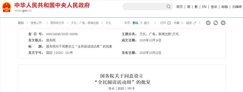 你署关于设立“全民阅读活动周”的请示收悉。同意自2026年起,将每年4月第四周设立为“全民阅读活动周”。具体工作由你署商有关部门组织实施。