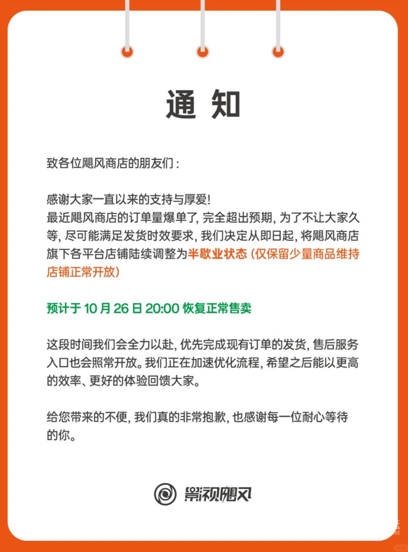 10月22日,影视飓风商店发布通知,最近商店订单量爆单,完全超出预期,为不让大家久等,即日起将飓风商店旗下各平台店铺陆续调整为半歇业状态,仅保留少量商品,维持店铺正常开放。据悉,影视飓风是由潘天鸿(Tim)创立并运营的综合性影视自媒体及公司,专注于高质量内容创作与技术分享。