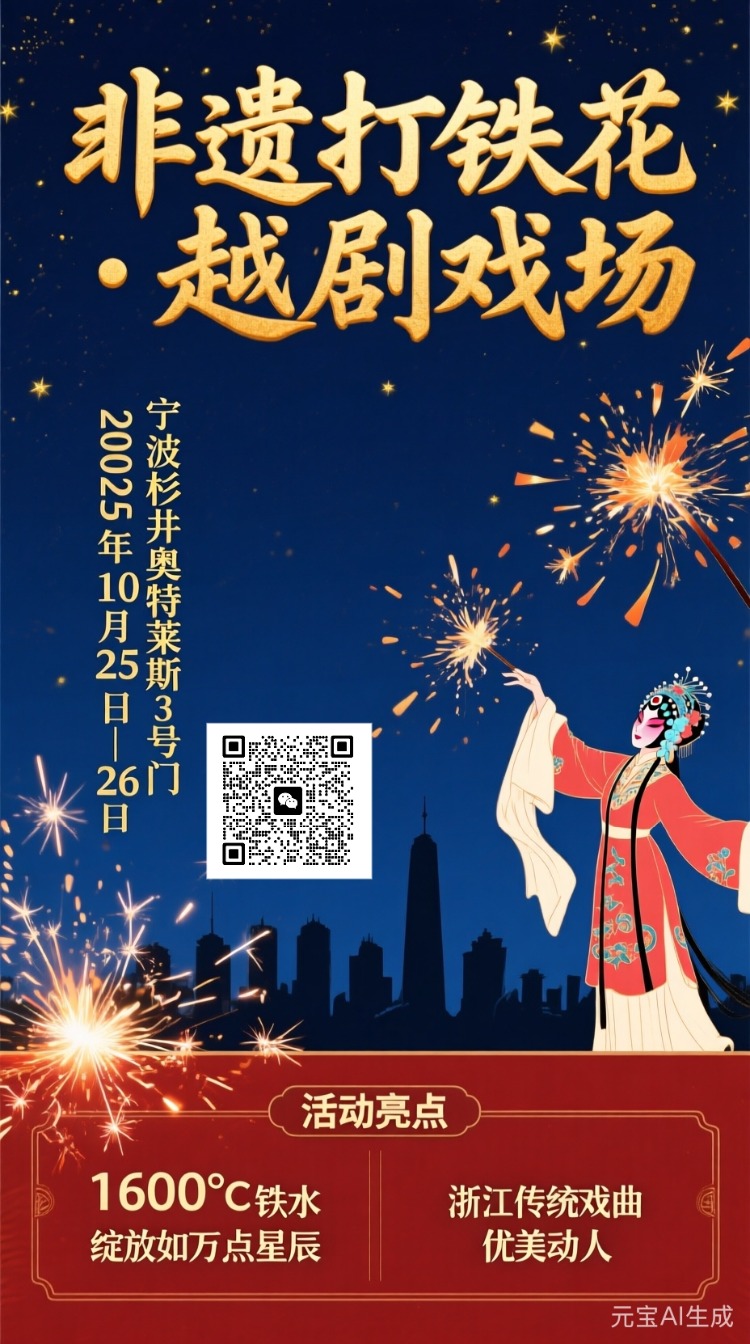 本周末(10月25日-26日)宁波杉井奥特莱斯3号门将举办非遗打铁花表演和越剧戏场活动。以下是具体信息: