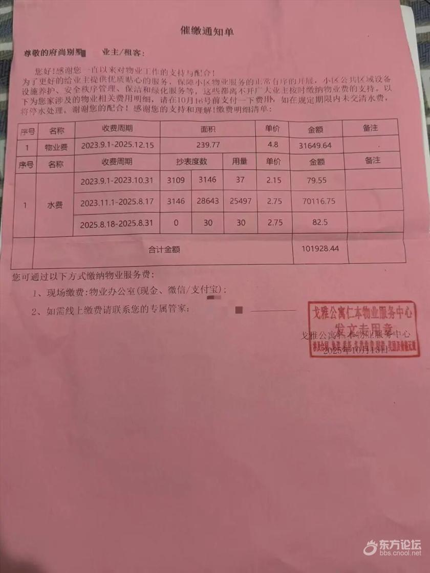 不到2年花了7万元水费! 今年,杭州萧山区闻堰街道戈雅公寓府尚别墅一位业主卓先生收到了一张催缴通知单,在水费栏目中,2023年11月1日至2025年8月17日,水费高达70116.75元。在收费明细中,2023年11月1日至2025年8月17日用水量相当惊人,25497吨。 ![]() 催缴通知单 受访者提供 府尚别墅的水费是由小区物业“代收代缴”,因此,不到两年的时间就产生如此高昂的水费,这引起了业主和物业的争论。 近日,潮新闻记者来到了府尚别墅了解相关情况。 水费异常或与水管漏水相关 催缴水费和水管漏水,谁来通知? 府尚别墅的房龄已有10多年,依山而建,共用围墙的几幢别墅面积相差不多。 卓先生的别墅面积239.77平方米,和卓先生面积差不多的别墅业主表示,他们一般是一季度到半年缴纳一次水费,有一家就3口人住,一年半的水费是1.7万,另一家就2个人平时水费不会超过1000元/月。 ![]() 戈雅公寓 章然摄 听说卓先生家的水费不到2年就高达7万元,邻居们有点疑惑,金额怎么会这么高,“应该及时去缴费,估计是水管漏水吧,他们要是早点发现就好了。” 卓先生的母亲告诉记者,这幢别墅是他们在2023年9月入住的,当时并不知晓是物业“代收代缴”的水费,误以为水费是线上扣款,所以一直没有去物业缴费。卓先生表示,这点是他疏忽了。他称,一家人入住别墅后,直到2025年6月份,他在微信上接到物业发来的水费通知单,7万元,“我都傻眼了。” 2023年9月份至2025年6月,他没有收到来自物业方面任何关于催缴水费的通知和水管漏水的提醒。 “如果我们家的水费连续几个月异常高,物业有义务提醒我们是不是水管漏水了,而不是放任不管,直到快2年过去了,才给我们一张通知单,要缴纳7万元水费。”卓先生说,两年期间,有2次水管发生问题,都是他自己发现并处理,一次是2024年发现后院漏水,他赶紧报修,另外一次发现热水器水管出现问题,卓先生也找了物业来修理。“这两次漏水,物业都没有提醒。” 卓先生认为如此高昂的水费背后是物业失职,所以拒绝支付7万块钱的水费。 2025年8月,双方矛盾激化:“第一次物业来拆水表,我收到通知了,但我没有同意,从我的视角来看,就是物业强拆水表。”卓先生报警,经过调解,重新安装了新水表。 10月15日,“物业又第二次来拆水表,这次我没有收到通知。”卓先生表示,他再次报警,但是这次调解因为各种原因未能成功。“物业方面表示需要结清水费才能安装水表。” 停水期间,“没有水做饭、洗澡,日常生活都成了问题,只能临时去酒店和亲戚家借住。” 目前,卓先生找了师傅来为家里安装了一个水表,家里已经恢复了正常用水。“但是高昂的水费问题不解决,我们还是非常担心的。不知道会不会再次停水。” 物业垫付7万元水费 被证实双方协商水费金额陷入僵局 记者联系到萧山供水有限公司相关人员,对于此事,该工作人员表示清楚相关情况,第一点是物业方确实已经支付了所有的水费,费用已结清;第二点是7万元水费确实是在卓先生的水表下产生的费用。“水管老化在所难免,要定期排查关注下,他们家的情况应该是水管漏水,目前矛盾主要是在物业和业主之间,水费已经结清了也没法减免。” ![]() 卓先生家重新安装的水表 章然摄 戈雅公寓项目经理张女士表示,“仁本物业将于12月离场,需要在离开之前,收齐业主欠下的款项。不止这一家发生了水管漏水的情况,也有一家因水费金额比较高,要付4万块钱。”针对这些水费较为高昂的业主,张女士表示正在与他们协商,“我们已经垫付了资金,我们也需要收回款项,才能维持公司的正常运转。” 张女士说,卓先生家不仅仅有7万多元的水费欠款,2023年9月1日至2025年12月15日的物业费31649.64元也还没有缴纳。“我们当然希望业主能全部缴纳拖欠的水费和物业费,至于折中处理的办法,未能和业主达成共识,如果实在不能协商,考虑走司法程序。” 两次拆水表的缘由,物业表示,是业主未能及时缴纳水费,所以他们不得不及时止损,先拆除水表。“拆除之前,我们提前三天通知业主了。” 至于卓先生表示物业未能尽到提醒的义务,张女士称,在卓先生欠费的两年内,物业有过提醒和催缴,但未能得到业主的回复,并表示有相关证明资料,但考虑到多方面的原因和业主隐私,不方便提供给记者。 记者从闻江社区了解到,物业和业主对于高额的水费有一些争议,社区已经组织了多次协调会,后续也会持续关注并希望促进事情的解决。 律师:拆除水表行为不妥 建议要合理合法催缴 物业和业主卓先生因为水费陷入僵局,针对这种情况,记者咨询了相关律师,浙江丰国律师事务所主任陈松涛表示,从法理上来说,权利和义务相统一,既然物业有“代收代缴”水费的权利,物业应承担相应的提醒义务。 “譬如小区水费若是一季度收一次,物业发现水表异常后应该提醒业主。该季度内产生的高额水费费用由业主承担,但过了这一季度,物业未尽到提醒责任,后续产生的水费物业也应承担相应的部分责任。” 北京中闻(杭州)律师事务所律师邱润照说,两年的水费高达7万元相当异常,一般来说,家庭正常用水不会产生如此大的消耗量。应明确水管爆裂的具体位置,才能推定责任承担的主体。业主只会对专有面积内的用水设备承担相应维修责任,非专有部分由物业承担,建筑红线范围外由市政承担。 至于物业拆除业主家水表催缴的行为,记者也咨询了一些律