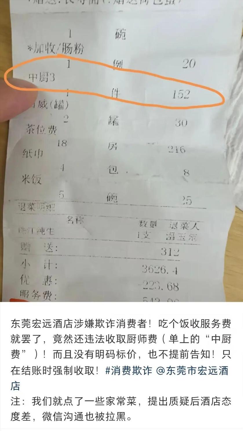 近日,市民朱女士在社交平台上反映,自己国庆期间在广东东莞宏远酒店与亲朋好友聚餐,结账时发现,自己不仅被加收了15%的服务费还有一笔152元的“中厨费”,而这两项费用酒店都没有提前告知。 10月24日,南城市场监管分局回应记者,经核查,宏远酒店的“中厨费”是因为系统错误导致错收投诉人的费用。 ![]() 网友投诉: 吃饭被多收“152元中厨费” “酒店不应该提供厨师吗?厨师还要单独收费?”10月1日,朱女士在东莞宏远酒店订了2桌与亲朋好友聚餐,结账时却看到账单上有服务费和厨师费,这让她吃了一惊。“我们没有任何定制菜,都是按菜单点的家常菜,而且这两项费用酒店也没有提前告知、明码标价。” 小票上显示,费用小计为3946.68元,其中包含中厨费152元、服务费543.96元。朱女士告诉记者,他们后来了解到,服务费是按照消费金额的15%收取的,消费金额里也包括了厨师费。“也就是说,我们最后又被收取了一轮厨师费的服务费!” 记者查看了朱女士提供的聊天记录,在订房沟通的过程中,酒店方并未提到服务费以及中厨费的收取及收费标准,对方发来的线上菜单里也未提到这两项费用。 ![]() 朱女士称,事后的维权沟通并不顺利,酒店承认收取了“中厨费”,但对于这项收费没有任何解释说明,也没有处理。10月13日,朱女士一家投诉至12345,酒店打来电话沟通,但双方仍未达成一致,第二天朱女士一家再发消息给订房的工作人员,发现微信已被拉黑了。 ![]() 朱女士家人微信被酒店工作人员拉黑。 中厨费到底是什么费用,有怎样的收费标准?与服务费有何区别?10月22日,记者就此事致电宏远酒店,有关工作人员表示,相关情况已向市场监管局说明,等市场监管局官方处理结果,不接受媒体采访。 南城市场监管分局: 酒店系统错误导致错收,仅此一单 10月24日,南城市场监管分局回应记者,经核查,宏远酒店的“中厨费”是因为系统错误导致错收投诉人的费用,事后酒店已对系统作出整改修复,堵塞漏洞。 根据投诉人向南城市场监管分局提供的投诉材料,分局受理后联系投诉人和被投诉人东莞市宏远酒店有限公司开展调解。投诉人表示要求退款服务费 544 元、“中厨 3”费 152元等。被投诉人表示,有关服务费事项已在菜牌尾页有温馨提示“房间加收 15%服务费”,退还服务费的诉求还在协商中;而对于“中厨 3”费用,因点菜系统错误和工作人员信息不对称等造成了误解,酒店愿意退款,经计算可退款220元。目前,被投诉人就上述方案尚在与投诉人沟通中。 ![]() 东莞宏远酒店。来源:东莞宏远酒店官网 另一方面,南城街道市场监管分局根据投诉人提供的情况依法对宏远酒店进行了现场检查。经查实,宏远酒店持有有效的营业执照和食品经营许可证,所有菜品已明码标价,并在菜单上对需要加收15%服务费作了温馨提示。关于“中厨费”,据宏远酒店供述,是因为系统错误和工作人员信息不对称等才会出现在投诉人的账单上,仅此一单,并非常规收费。 南城市场监管分局依据《消费者权益保护法》的有关规定,现场已责令宏远酒店立即修复系统漏洞,并做好投诉人的解释工作,将错收的费用退回给投诉人,保障投诉人的知情权和选择权。 同日,朱女士告诉记者,几经沟通协商,酒店已退还服务费、中厨费695.96元。 |