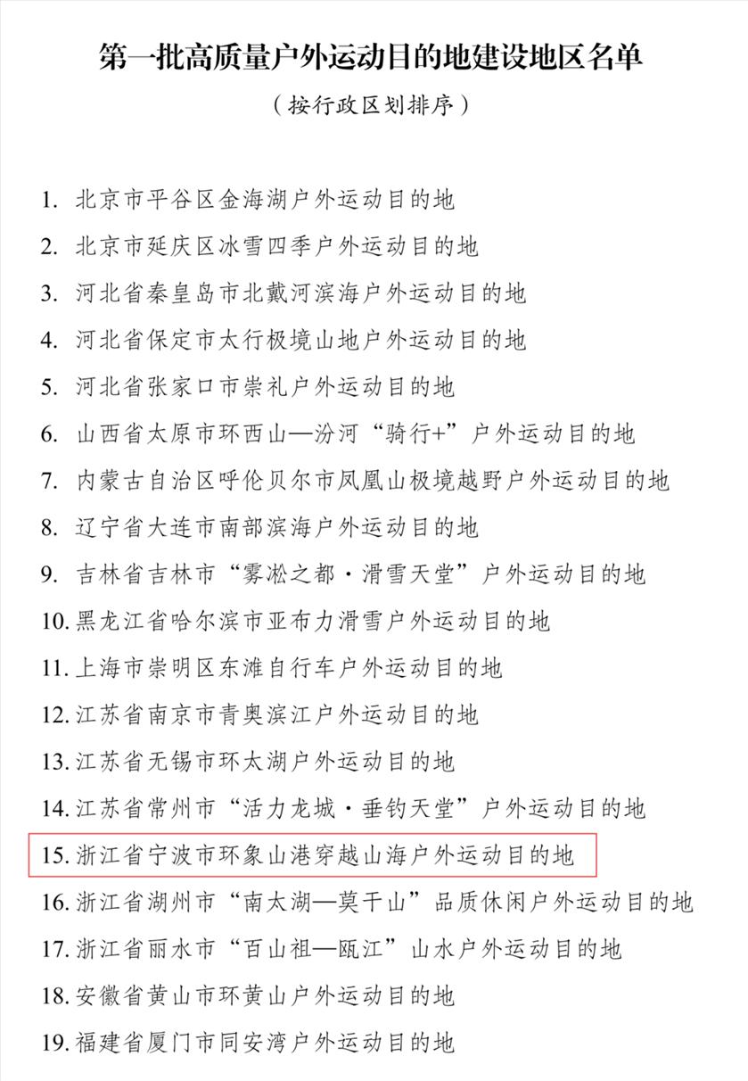 近日 国家发展改革委、体育总局等 六部委联合印发通知 公布第一批 高质量户外运动目的地建设地区名单 宁波市 “环象山港穿越山海户外运动目的地” 成功入选 ↓↓↓ ![]() ▲部分名单截图。 “环象山港穿越山海户外运动目的地”核心区覆盖宁海、象山两县的23个乡镇(街道),陆域面积约2022平方公里。目的地以“穿越山海”为主题,巧妙依托本地丰富的山海资源,规划构建“一山一湾一港”的户外运动空间格局——