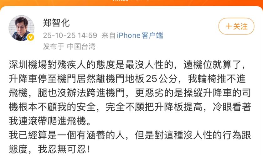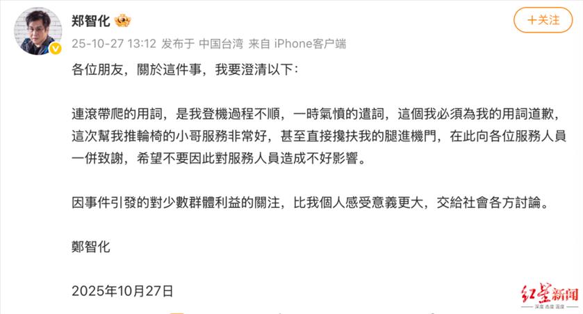 | 10月27日,歌手郑智化通过社交媒体就“连滚带爬”表述致歉。  此前报道: 10月25日下午,歌手@郑智化 在微博发文,称深圳机场对残疾人的态度没人性,升降车离机门地板25公分,他的轮椅推不进飞机,腿也跨不进机舱门,操纵升降车的司机完全不愿把升降板提高,冷眼看着他连滚带爬进飞机。 郑智化怒斥:我已经算是一个有涵养的人,但是对这种没人性的行为跟态度,我忍无可忍!  记者注意到,10月25日下午18:05,深圳机场在郑智化微博下进行了回复: 尊敬的郑先生,我们已关注到您反映的情况,对现场服务给您带来的不便和困扰深表歉意。对于相关问题,我们已第一时间会同航空公司启动核查。我们将以此为契机,全面审视并优化特殊旅客的服务保障细节,更好保障每一位旅客顺畅出行。  10月25日晚,深圳机场发布通报称,对郑智化反映的情况,机场高度重视,联合航空公司对现场保障情况快速进行了核实。 郑智化于10月25日下午从深圳乘坐深航ZH9073航班前往台北。因该航班前序航班到达时,国际及地区航班近机位资源已饱和,深圳机场安排该航班远机位停靠。为方便乘坐轮椅的旅客登机,深圳机场安排行动不便旅客登机车进行保障。由于在旅客上机和货物装载的过程中,飞机会出现上下移动,为防止保障设备刮碰飞机,根据安全操作规范,登机车与飞机舱门需保持20cm的高度差,由此给轮椅旅客进入客舱带来不便。最终,在1名航司地服人员和1名机组人员协助下,郑智化通过登机车安全进入客舱。 深圳机场表示,针对这次登机保障出现的不足,机场联合航司立行立改,进一步完善轮椅旅客服务保障流程和措施:自10月25日晚间起,将为有轮椅旅客的航班尽可能提供廊桥靠接保障,对于确实无法靠桥的航班,轮椅旅客现场保障人员数量由1名增加至2名,强化现场保障能力; 试点启用前期已研发测试的有一定坡度的登机连接装置,解决行动不便旅客登机车及廊桥与飞机舱门高度差给轮椅旅客登机带来的不便,更好地帮助旅客安全顺畅登机。 对于此次服务保障带来的不便,深圳机场再次表示歉意。  随后,郑智化回应称,深圳机场已经对他个人提出道歉,他不再追究此事,相信这件事只是一个开升降车司机个人的恶劣行径,而非整个机场的问题,只希望借由此事,深圳机场能优化对残疾人士的服务和协助。  郑智化,中国台湾男歌手,代表作有《水手》、《星星点灯》等,郑智化小时候因小儿麻痹症落下终身残疾。  |