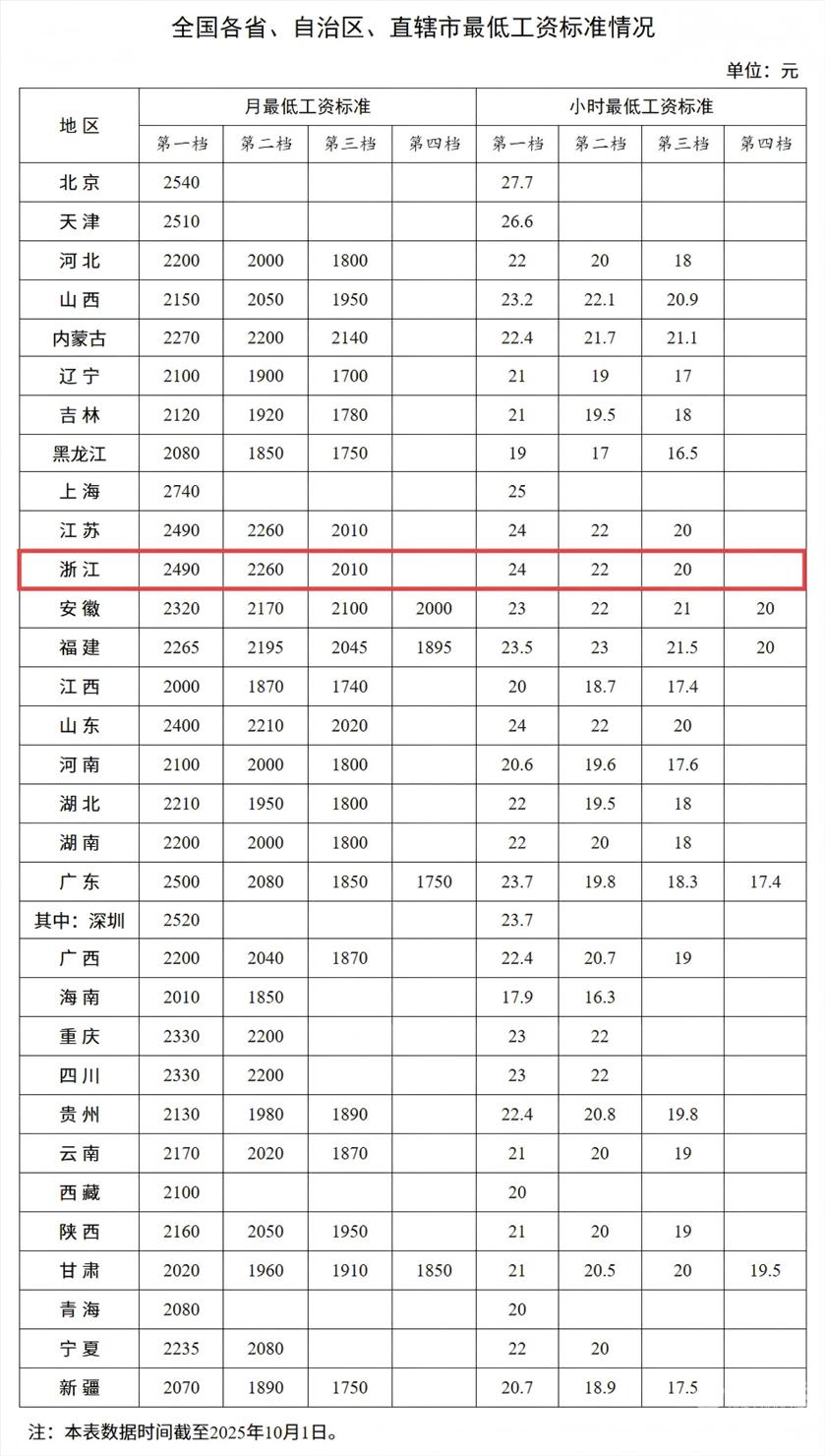 近日 人社部官网公布 全国各省、自治区、直辖市 最低工资标准情况 (截至2025年10月1日) 浙江的情况如何? ![]() 目前,最低工资标准档位最多为四档。截至2025年10月1日,数据显示,从月最低工资标准看,上海以2740元的标准居全国首位;从小时最低工资标准看,北京以27.7元的标准为全国最高。 其中,浙江月最低工资标准为第一档2490元、第二档2260元、第三档2010元;小时最低工资标准为第一档24元、第二档22元、第三档20元。 ![]() 最低工资标准,是指劳动者在法定工作时间或依法签订的劳动合同约定的工作时间内提供了正常劳动的前提下,用人单位依法应支付的最低劳动报酬。 所称正常劳动,是指劳动者按依法签订的劳动合同约定,在法定工作时间或劳动合同约定的工作时间内从事的劳动。 劳动者依法享受带薪年休假、探亲假、婚丧假、生育(产)假、节育手术假等国家规定的假期间,以及法定工作时间内依法参加社会活动期间,视为提供了正常劳动。 用人单位不执行最低工资标准将违反劳动法、劳动合同法等法律规定。 用人单位低于当地最低工资标准支付劳动者工资的,应当支付其差额部分。不支付的,由劳动行政部门责令限期支付。逾期不支付的,依法责令用人单位向劳动者加付赔偿金。 对违反最低工资标准规定的用人单位,劳动者有权投诉举报,举报途径包括12333热线、属地劳动保障监察机构等,也可依法申请劳动争议仲裁、向人民法院提起诉讼。 你明白了吗? |