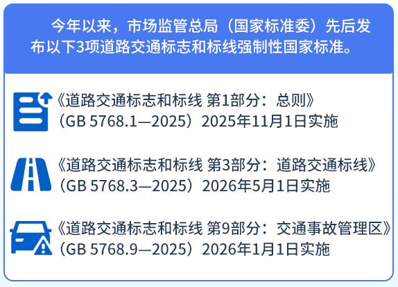 据市场监管总局消息 3项道路交通标志和标线 强制性国家标准 将于今年11月起相继实施 ↓ 今年以来,市场监管总局(国家标准委)先后修订发布《道路交通标志和标线 第1部分:总则》《道路交通标志和标线 第3部分:道路交通标线》和《道路交通标志和标线 第9部分:交通事故管理区》3项强制性国家标准。