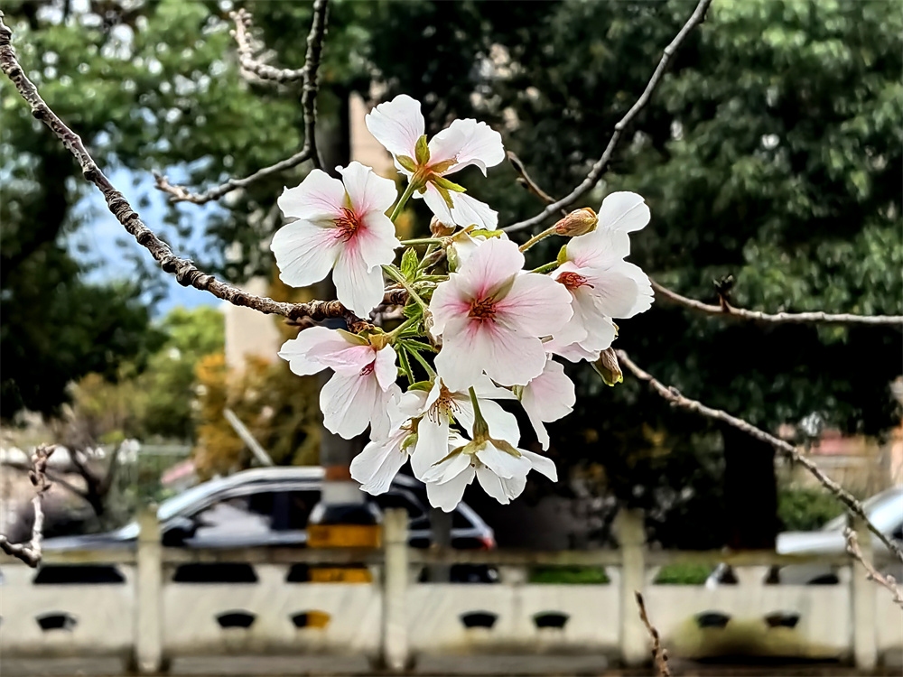 桂花开放的同时,那里的樱花也有几株开了,本来樱花应该在早春开的,只是因为近来气温近似春天,所以樱花也来凑热闹,俏然开放了。