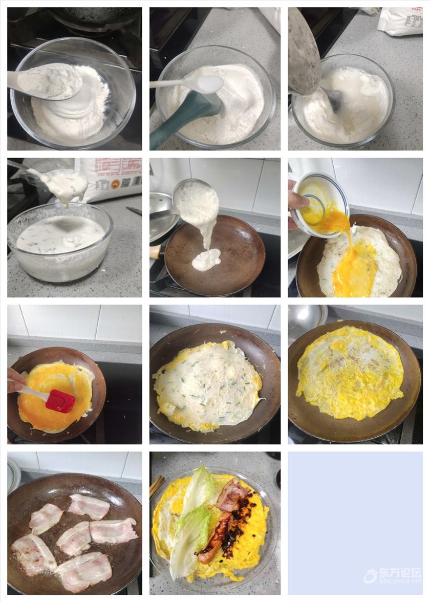 图1:按人均1--1.5勺加面粉待用;图2:加入适量的盐;图3:加入适量凉白开(不建议用自来水,可用纯净水或矿泉水);图4:加入阳台种的小葱,剪断直接加;充分搅拌后,成流动性不差的流体即可,放冰箱,第二天一早待用。图5:热锅,也可以刷一层油,待锅热(不要等锅冒黑烟那种热),倒入面粉液,并用刮片或锅铲刮平,图6:待一面煎熟,翻面并倒入打好的蛋液(这里建议鸡蛋不要直接打到面饼上,而是碗里提前打好。万一鸡蛋坏的,那这个饼就废了,早餐就不够了)图7:倒入蛋液后,用刮片将蛋液刮平;图8:另外一面煎熟后,将有蛋液一面再翻过去;图9:不一会蛋液那面也熟了,反过来就是这样的,时间不要太久,太久蛋就老了;图10:提前煎熟的培根;图11:将煎熟的蛋饼盛出到盘子里,加入生菜+培根+热狗肠(空气炸锅提前烤好的),酱料随便加。
