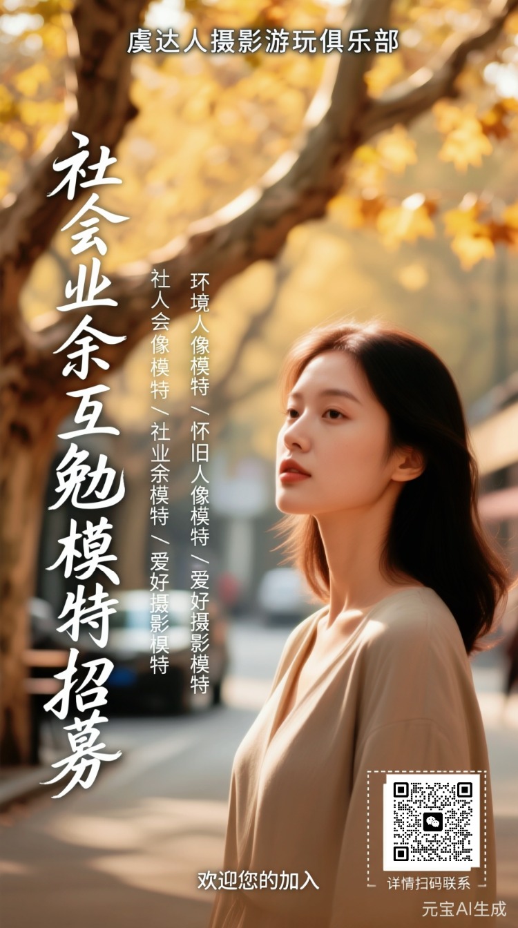 虞达人摄影游玩俱乐部社会业余互勉模特招募环境人像模特怀旧人像横特社会业余模特爱好摄影模特欢迎您的加入详情扫码联系,