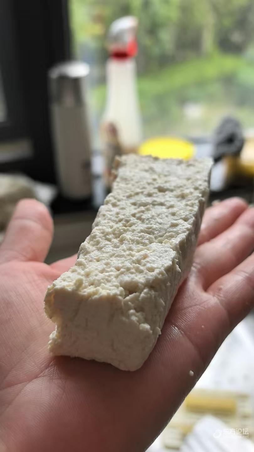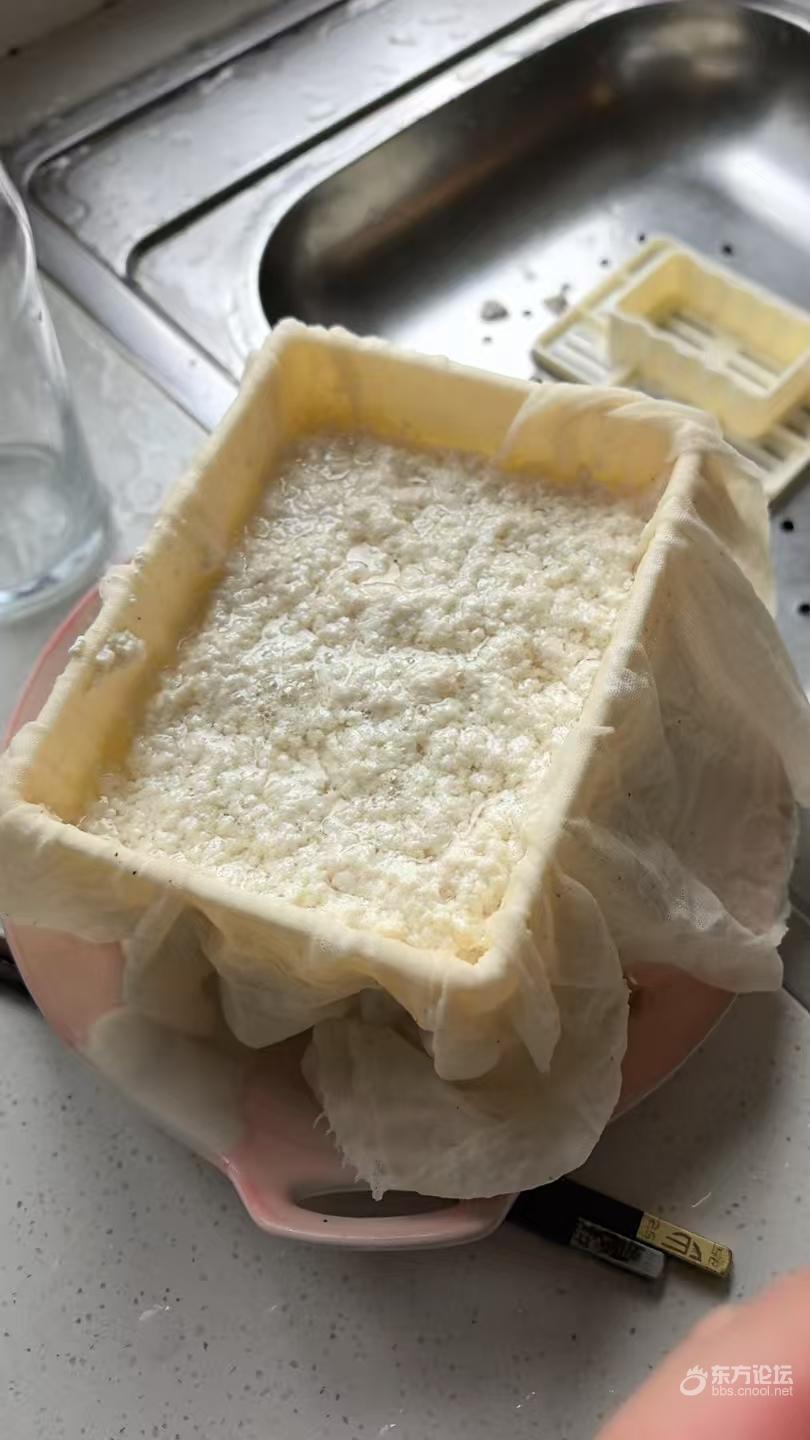 从小喜欢吃豆制品的我,看到网暴食品的各种添加剂, 心血来潮网购了做豆腐的模具。 昨晚一到货, 马上行动起来。 2.把泡好的豆洗干净,加入500ML水放进豆浆机里, 按果汁键(千万不能按豆浆键) ![]() 4.把豆浆加入锅里,把上面的泡沫拿掉, 开大火, 边煮边搅动以防粘锅。 等豆浆开后转小火再煮五分钟 , 把豆浆味都熬出来。 ![]() ![]() 7.用热水泡一下布后铺在模具里,再把豆花放进去,上面放一个重物压15-30分钟,想要嬾一些时间就短一些,我这个豆腐因上班赶时间只压了10分钟 ![]() ![]() ![]() ![]() ![]() 晚上下班后第一件事就是做香煎豆腐,切成小块, 再外面加一成蛋液, 油煎二面金黄。 在底油里加入自己种的青红辣椒, 最后加入大蒜出锅, 满满的豆香味, 味道非常非常赞!