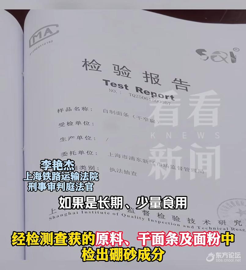 公诉人:加在哪些品种里面? 林某聪:就干面,加一点点。 公诉人:硼砂可以加到面里面吗? 林某聪:不可以。 法官:加了硼砂的面条,如果人吃的话会有什么危害? 林某:也没什么危害,最多吃了有的人会肚子痛。 ![]() 由于加入硼砂制作的干面条外观鲜亮,久煮不烂,不少顾客因此频频回购。今年5月,公安机关和市场监管部门在联合检查行动中,在店内查获硼砂原料 2.43千克。经检测,店内的干面条和面粉中,均检出硼砂成分。 硼砂,它的化学名叫四硼酸钠,它是一种化工原料,如果是长期、少量食用含有硼砂的食品,可能会造成毒素在体内堆积,无法排泄出去,可能会造成一种慢性中毒。