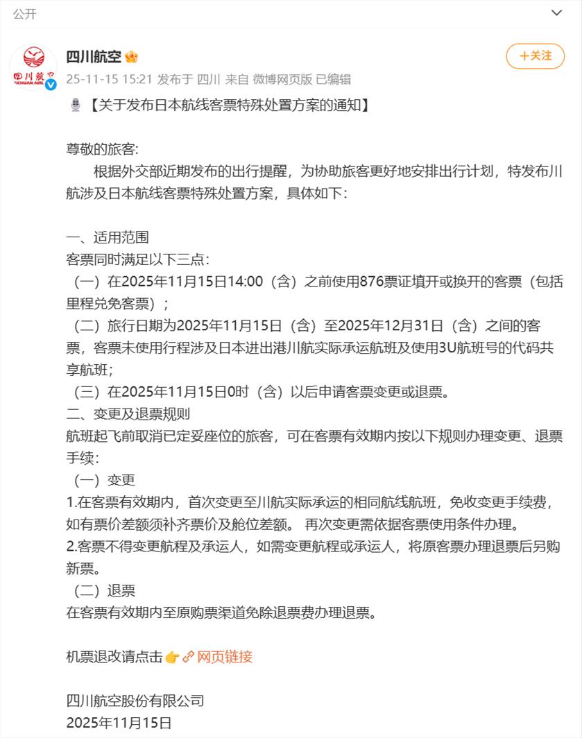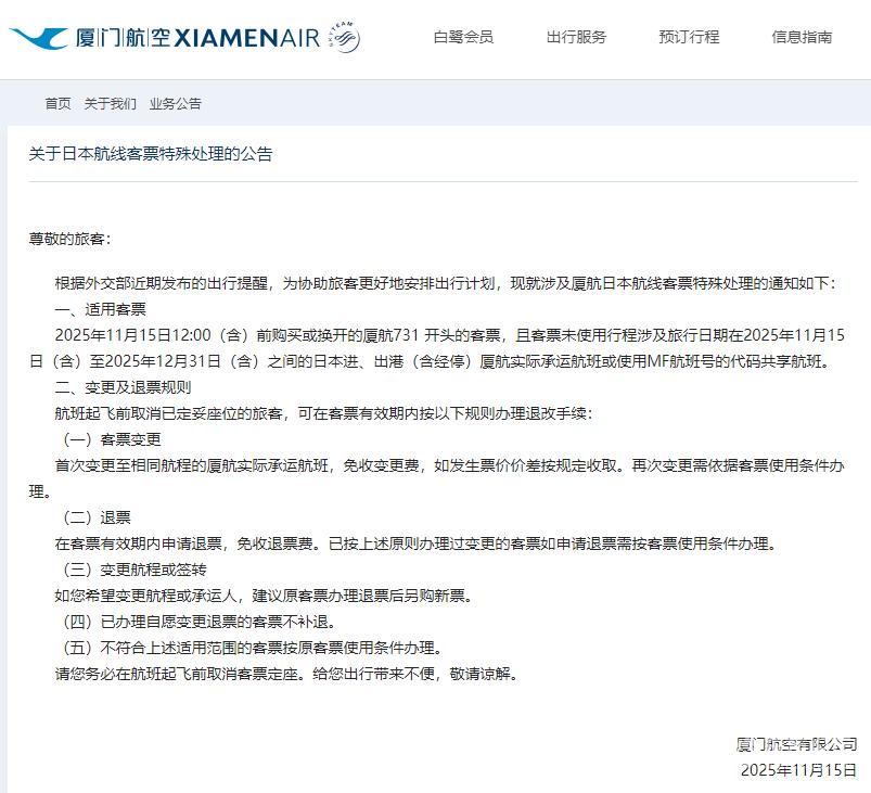 14日,外交部和中国驻日本使领馆就中国公民前往日本发布郑重提醒。 15日,国航、南航、东航、川航等多家航司已发出通知,公布了涉及日本航线客票的特殊处置方案,对于出行日期在12月31日之前且符合相关条件的客票,可予以免费退改处理。 ![]() 国航在通知中明确,对于在今年11月15日12时(含)前购买或换开产生新票号的国航999开头的客票(包括里程奖励客票);客票未使用行程涉及旅行日期为2025年11月15日(含)至2025年12月31日(含)之间东京、大阪、名古屋、福冈、仙台、广岛、札幌、冲绳进出港的国航实际承运航班和挂CA航班号的代码共享航班;在2025年11月15日0时(含)以后申请客票变更或退票(以取消客票订座时间为准)。在客票有效期内,首次变更免收变更手续费,但需收取子舱位差价及淡旺季差价,再次变更需依据客票使用条件办理。在客票有效期内,可以办理未使用航段退票,免收退票手续费。 ![]() 南航在通知中明确,对于在今年11月15日12:00(含)前购买或换开的南航784开头的客票,且客票未使用行程涉及旅行日期在2025年11月15日(含)至2025年12月31日(含)之间的日本进、出港(含经停)南航实际承运航班或使用CZ航班号的代码共享航班,航班起飞前取消已定妥座位的旅客,在客票有效期内申请退票,免收退票费。首次变更至相同航程的南航实际承运航班,免收变更费,如发生票价价差按规定收取。 ![]() 东航在通知中明确,对于在今年11月15日12:00(含)前购买或换开的东航781客票填开的国际、地区或国内航班。客票中至少含有一段未使用的涉及日本(包括但不限于东京、大阪、广岛、札幌、小松、鹿儿岛、长崎、新泻、冈山、福冈、静冈、名古屋、松山、冲绳、富山、熊本)进港、出港或经停航班(包括东航、上航或其他航空公司航班),航班起飞日期在2025年11月15日至2025年12月31日期间,同一客票内的其他未使用航段日期不限。办理变更至原航班前后3天(含)以内的航班,可免费变更一次。再次变更或变更超出原航班前后3天(含)内的航班,需依据客票使用条件办理。在客票有效期内,可至原购票渠道办理未使用航段非自愿退票,免收退票手续费。 此外,川航、厦航均发布相关通知。 ![]() ![]() |