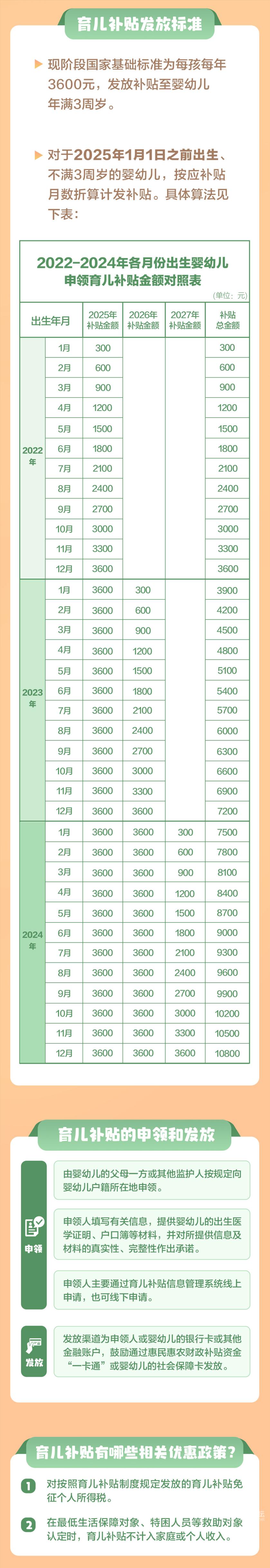 宝妈宝爸看过来 育儿补贴申领有时限 2025年将要过去 注意别错过申领时间 ↓↓↓ 对于2022年至2024年出生的婴幼儿,都应当在2025年提出育儿补贴申请,如果在今年内没有申请,将被视为自动放弃当年申请资格。这也意味着不能享受到当年育儿补贴。 2025年7月,《育儿补贴制度实施方案》正式发布,明确对符合法律法规规定生育的3周岁以下婴幼儿发放补贴。 每个孩子能够申领的金额,具体见下表: ![]() 育儿补贴主要通过全国统一育儿补贴信息管理系统申领,依托各地省级政务服务平台,设置育儿补贴申领专区,同时在支付宝、微信等第三方服务平台开通申领入口。在支付宝、微信、浙里办搜索“育儿补贴”,即可找到官方小程序。 ![]() |