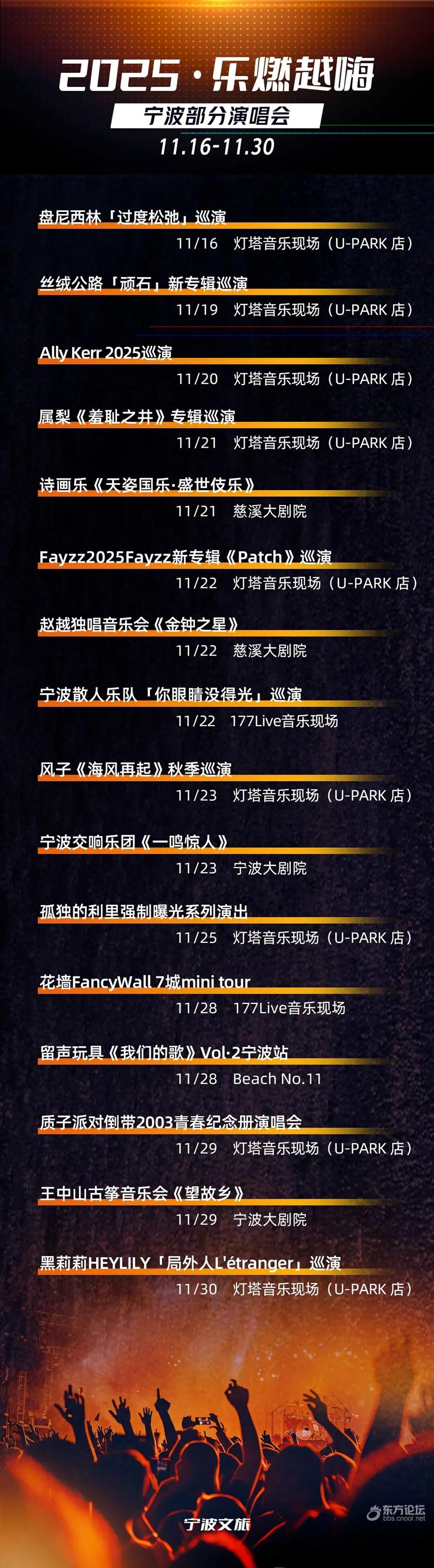 演唱会摇晃的荧光海 是最浪漫的星空 去现场,为所爱 在一首歌的时光里 我们将压力和琐碎抛诸脑后 只沉浸在音乐与热爱 十一月下半月 宁波这些演唱会(音乐会) 希望与您共同聆听 ↓ ↓ ↓ ![]()