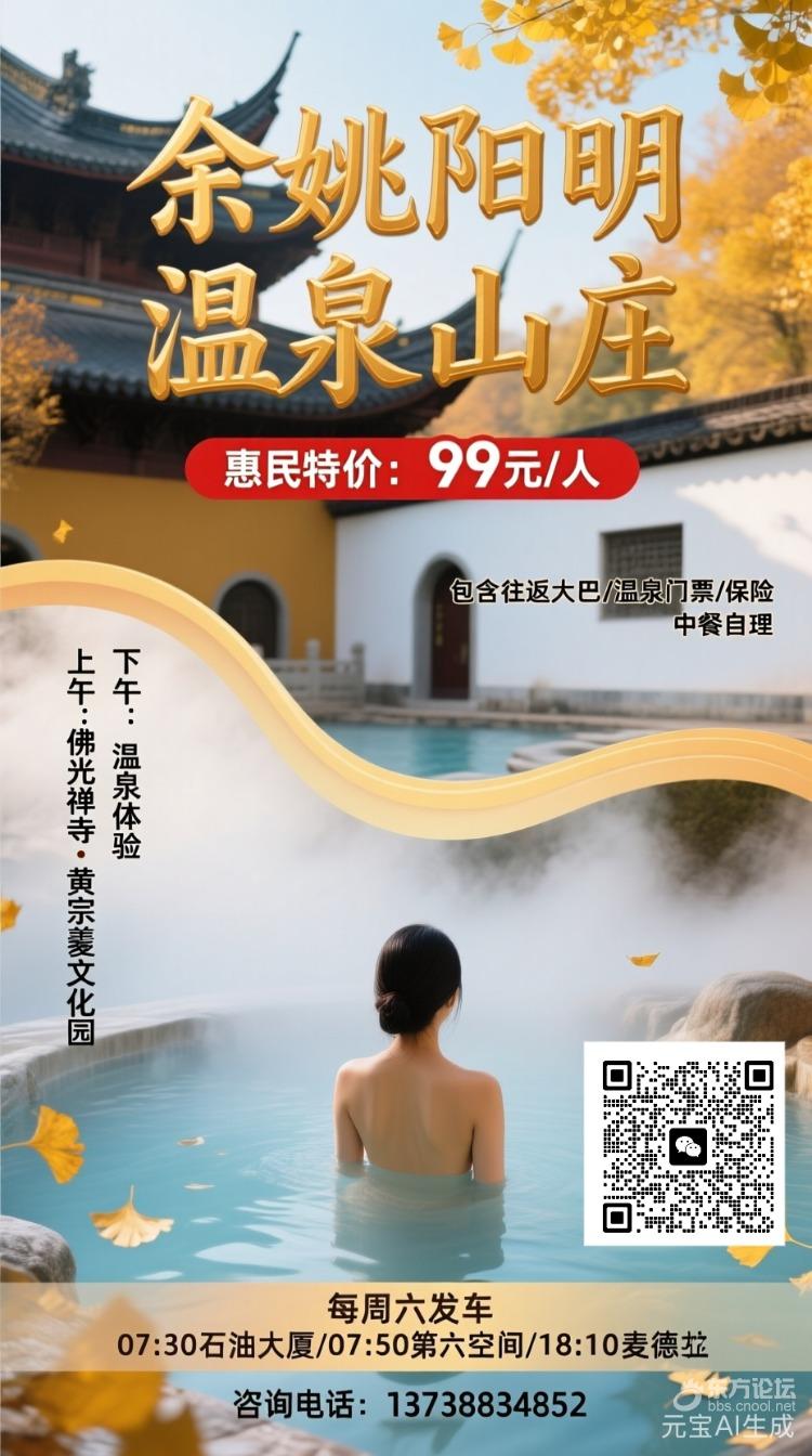 余姚阳明温泉山庄 惠民特价:99元/人(包含往返大巴,温泉门票,保险) 中歺自理上午游玩景点:佛光禅寺 黄宗羲文化园下午泡温泉发期日期:每周六集合时间上车地点:07:30 石油大厦07:50 第六空间艺术生活广场停车场08:10鄞州麦德龙详情咨询报名电话13738834852