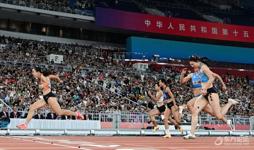 第三棒选手与第四棒选手交接场景。 这是陈妤颉在本届全运会上获得的第三枚奖牌。此前,她先后在女子100米和女子200米项目上夺得金牌,成为全运会历史上最年轻的女子短跑“双冠王”。 这两金一铜,“成色”十足。尤其是在百米决战中,她跑出11秒10,这是全运会有史以来的第二好成绩,仅次于亚洲纪录保持者李雪梅在28年前创下的10秒79。此后六届全运会,再无一人跑进11秒2。 作为一名未满17岁的小将,这个成绩不仅刷新了亚洲青年纪录和全国青年纪录,即使在成人组历史榜单上也异常耀眼。