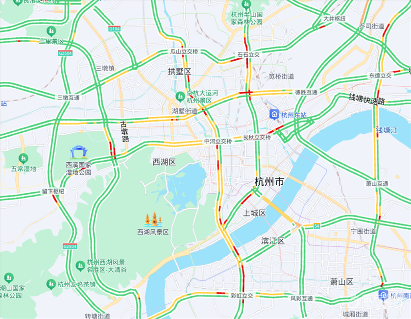 同样是周末下午两点,杭州和宁波的交通状况完全是两个世界。杭州地图上堵得“红到发紫”,而宁波主城区却是一片畅通的绿色。宁波人口接近千万,车子也有四百多万辆,但城区就是不怎么堵。当然,宁波人也爱玩,东钱湖、四明山这些热门景点该堵还是堵。那么问题来了,您是更羡慕杭州的热闹繁华,还是宁波的安逸通畅呢?宁波人口977.7万,机动车总保有量407万辆;杭州人口1262.4万,机动车总保有量478万辆。不过宁波虽然城区很通畅,但是一到周末上山下湖的人流还是很大的,看看东钱湖和四明山,都有红色的拥堵点。