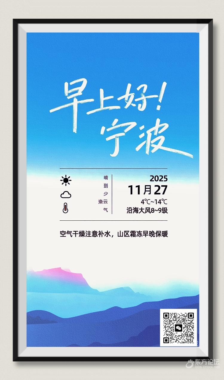 早上好!宁波今天(2025年11月27日)的天气情况如下:天气状况:晴到少云,阳光充足,适合户外活动。气温:最低气温:4℃左右(山区可能低至0~-2℃,有薄冰)。最高气温:14℃上下,体感微凉,建议穿防风外套。风力:沿海海面有8~9级偏北风,内陆地区风力较小,但早晚温差大(超10℃),注意及时增减衣物。提醒:空气干燥,注意补水和防火安全。冷空气影响下,28日早晨气温更低,山区可能有霜冻,早出晚归需保暖。未来几天持续晴好,周末气温将回升至20℃左右。祝您一天顺利! 🌞