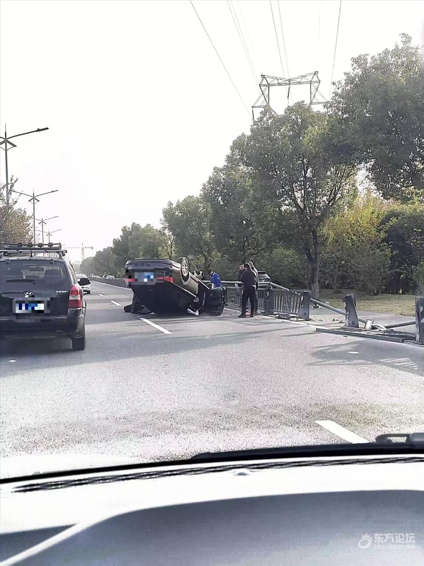 早上8点左右,奉化往西坞方向,路上堵得一塌糊涂,我还以为怎么了。开过去一看,原来是一辆车撞到护栏后四脚朝天了。想不通怎么会这么严重。