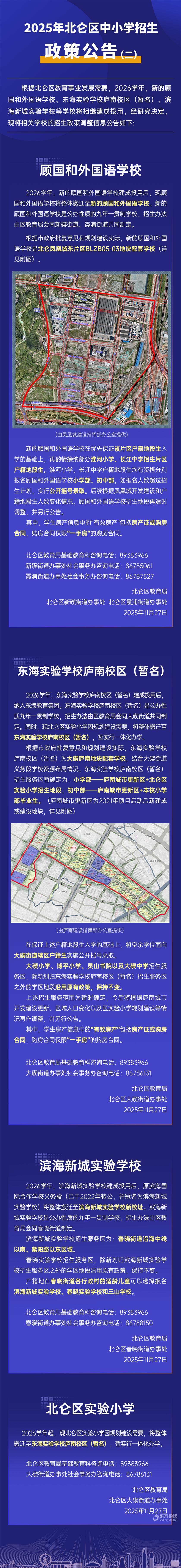 2026学年 新的顾国和外国语学校、 东海实验学校庐南校区(暂名)、 滨海新城实验学校等学校 将相继建成投用 近日 北仑区教育局发布 相关学校的招生政策调整公告 ↓↓↓ ![]() 针对家长关心的一些问题,北仑区教育局进行了解读。 (1)新的顾国和外国语学校2026学年起停止面向全区招生,调整为地段学校划片招生。新的顾国和外国语学校是北仑凤凰城东片区BLZB05-03区块的配套学校。学校在优先保证该片区户籍地段生入学的基础上,再酌情接纳部分淮河小学、长江中学片区户籍地段生。如报名人数超过剩余招生计划,实行公开报名,摇号录取。 (2)滨海新城实验学校2026学年起停止面向全区招生,调整为地段学校划片招生。在招生服务区的孩子可以报名滨海新城实验学校。 我们是淮河小学或长江中学片区的户籍生,如果参加顾国和外国语学校的摇号没摇上,还能回到原来对口的学校入学吗? 我们是大碶街道的户籍生,如果参加东海实验学校庐南校区的摇号没有摇上,还能回到原来对口的学校入学吗? (1)淮河小学、长江中学户籍地段生报名新的顾国和外国语学校小学部、初中部,如报名人数超过剩余招生计划,实行公开摇号录取。若摇号未被录取,则可以返回原地段学校按原顺序位录取。 (2)东海实验学校庐南校区(暂名)在保证庐南城市更新区里的户籍地段生入学的基础上,将空余学位面向大碶街道辖区户籍生招生。如报名人数超过剩余招生计划,实行公开摇号录取。若摇号未被录取,可以返回原地段学校按原顺序位录取。 北仑区实验小学整体搬迁至东海实验学校庐南校区(暂名),暂实行一体化办学,2026年符合北仑区入学条件的六年级学生可以直升东海实验学校庐南校区(暂名),也可以放弃直升,选择到对应的户籍地段学校报名。 |