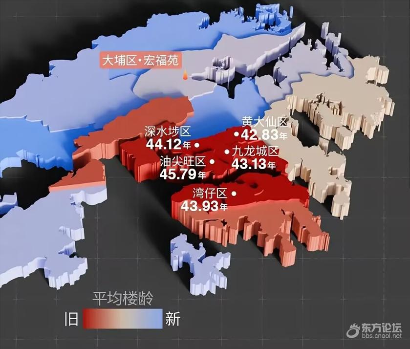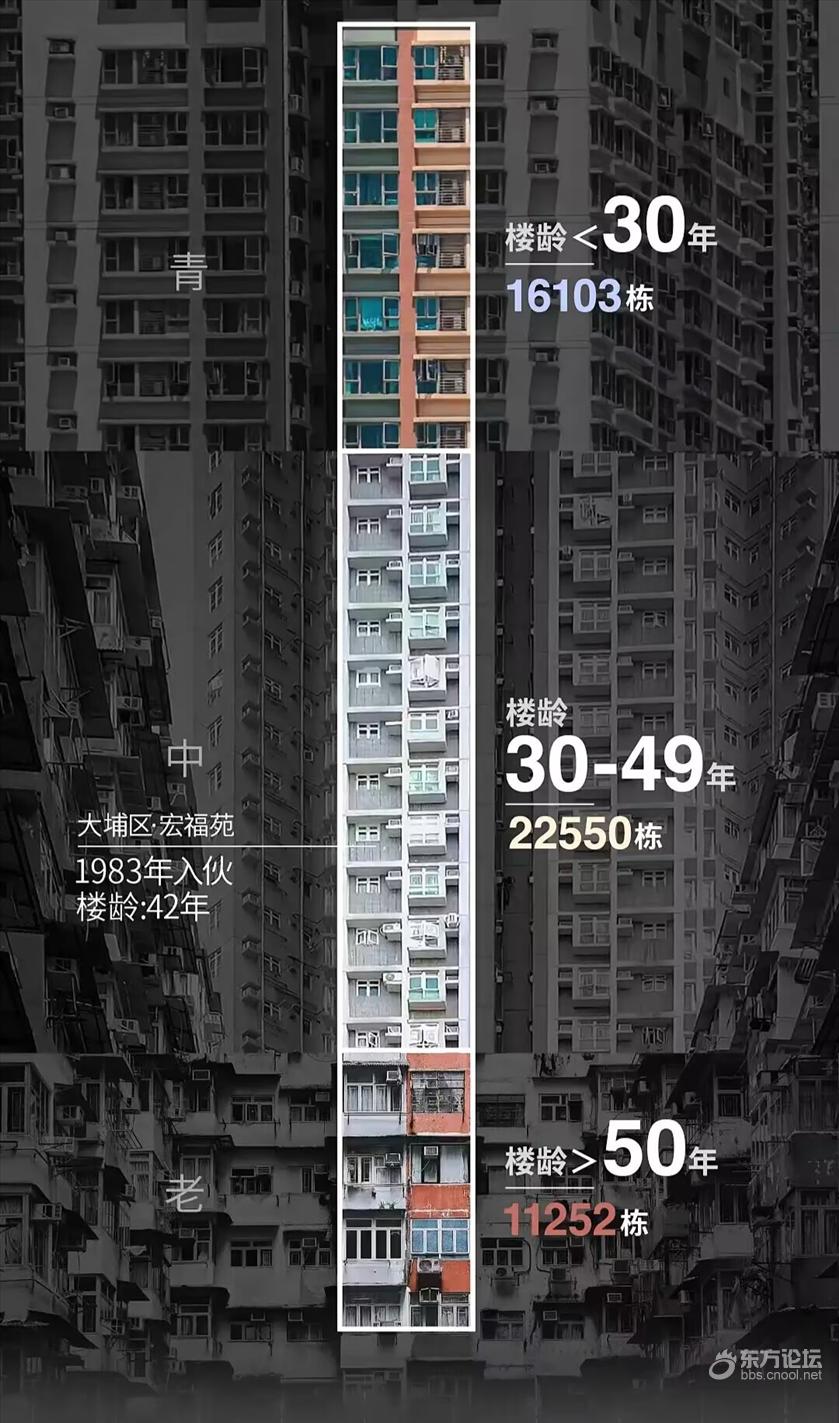 香港有5万栋住宅楼:楼龄小于30年的有1.6万栋,楼龄30-49年的有2.2万栋,楼龄30-49年的有2.2万栋,楼龄大于50年的有1.1万栋。