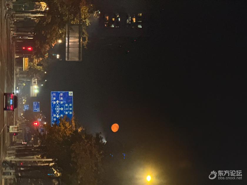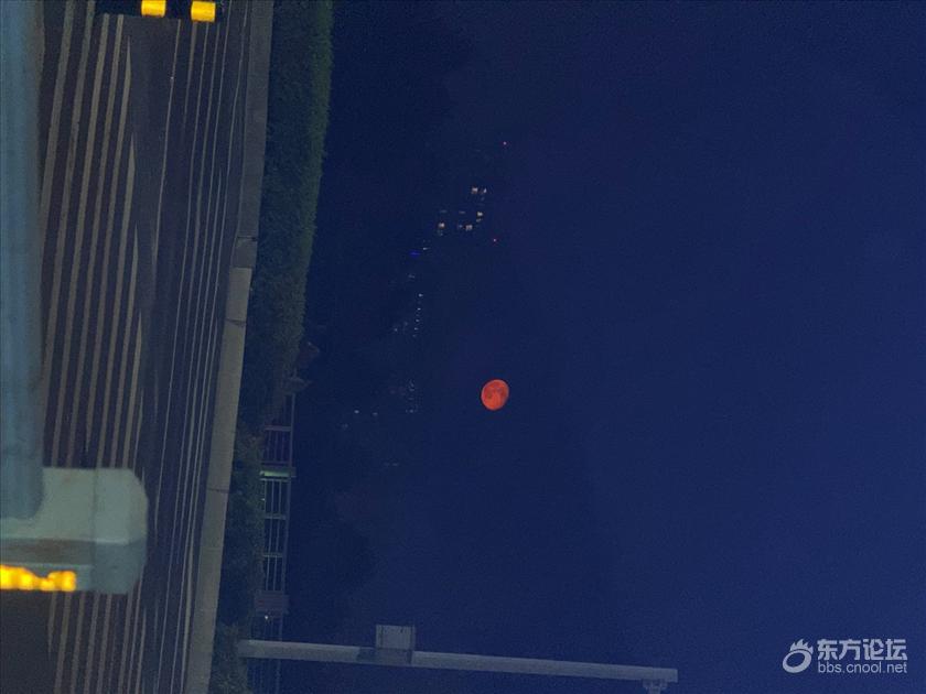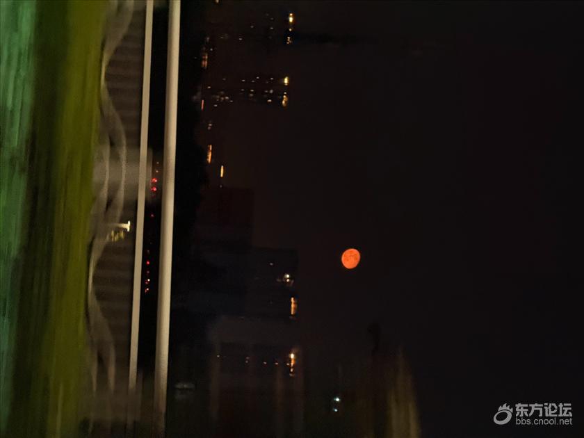 昨晚在外面准备回家,抬头发现有个很红很低很大的东西挂在天上 仔细一看是月亮,虽然不是完整的圆,但是也很圆了,在车上拍的 有点糊。