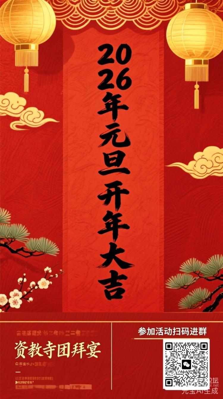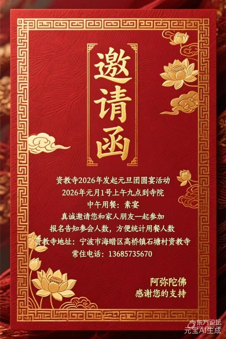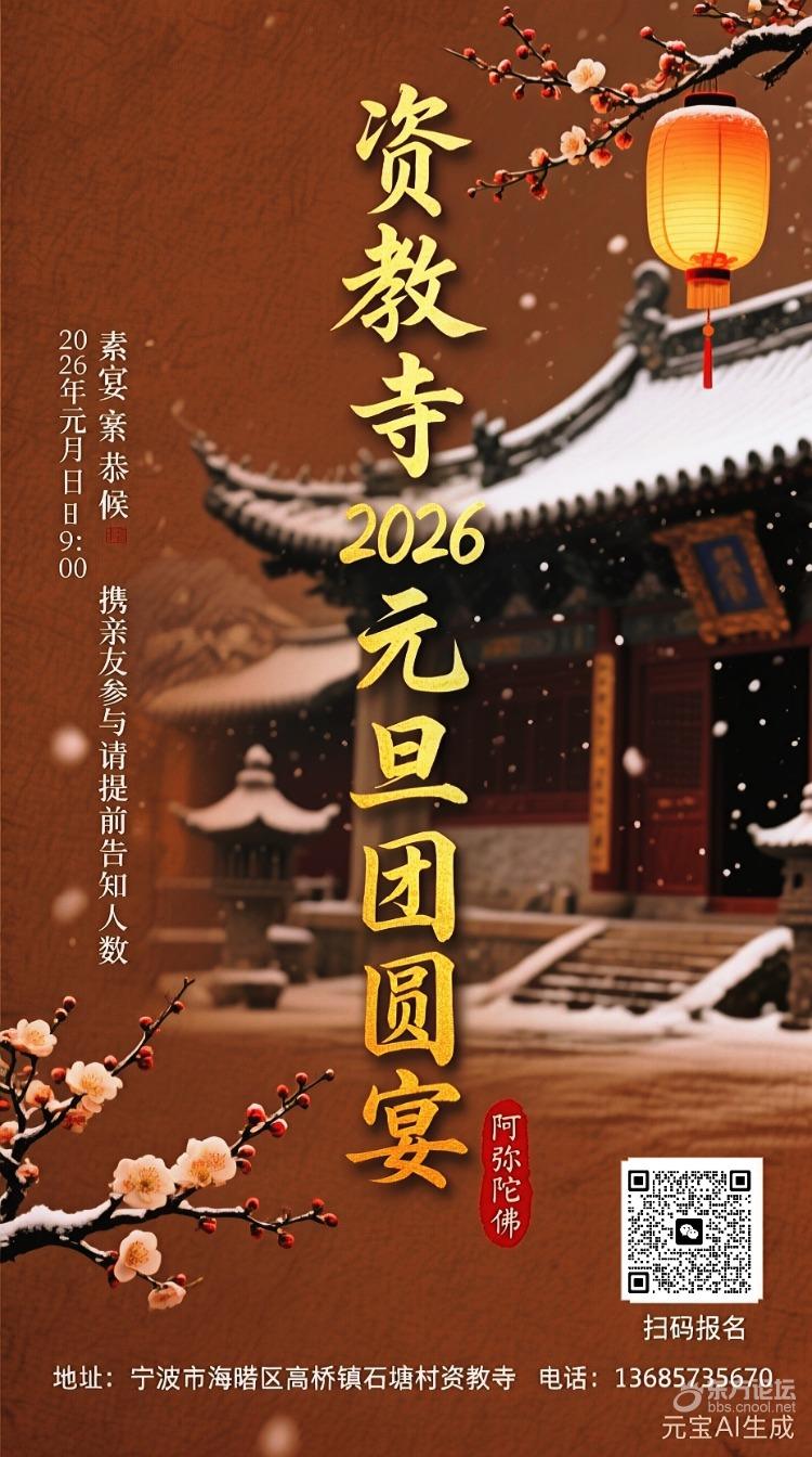 宁波资教寺元旦团圆盛宴.邀请函岁序更替,华章日新。一元复始之际,万象更新之时,资教寺怀着感恩之心,特于元旦佳日中午,备下暖心团圆饭,诚邀十方信众、四方善友共聚一堂,以欢声笑语共庆新岁,以禅心善愿同祈祥和。义工献艺送福至,歌舞琴音祈岁平安,除却团圆饭的温馨,寺院更有一场别开生面的"福运演出"静候光临。本寺义工团队发心筹备,以舞传情、以乐祈福:更兼古琴雅奏、书法挥毫,将一份份新年祈愿化作可视可感的艺术,为大众送上"福慧双增、平安顺遂"的祝福。(扫码报名) 宁波市海曙区资教寺