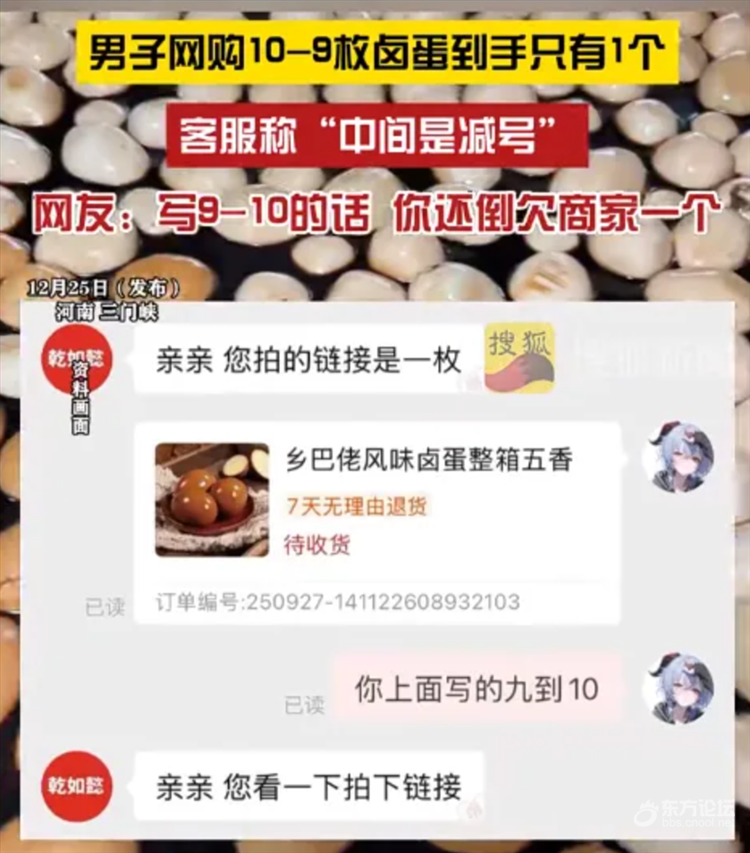 温馨提示 在东方热线APP参与每晚8点红包互动话题,你就有钱拿! |今日话题| 如今网购页面有不少文字陷阱,大家见过哪些? 小编先来: 近日有一则新闻,河南一男生网购”10-9”枚卤蛋,到手仅1个,客服:中间是减号!这操作属实让人大开眼界,大家平时网购有遇到什么陷阱吗?一起来说说看吧!