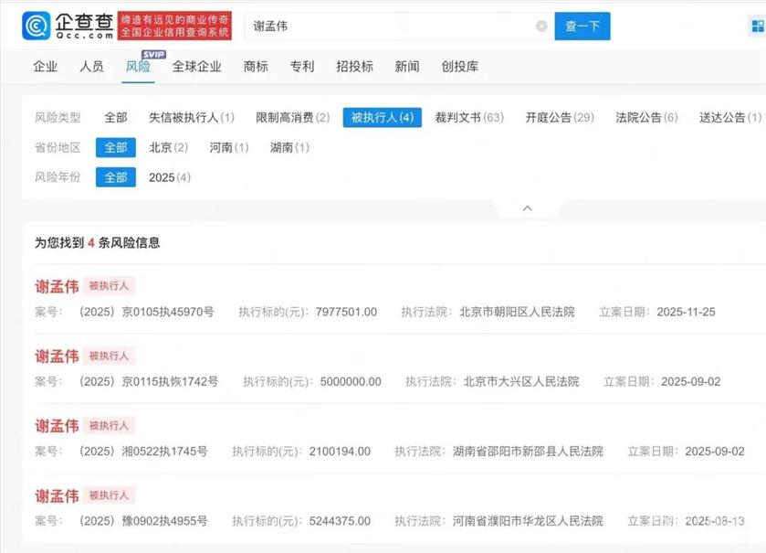 天眼查天眼风险信息显示,近日,谢孟伟(嘎子哥)因有履行能力而拒不履行生效法律文书确定义务,被郑州市管城回族区人民法院列为失信被执行人(老赖),履行情况为全部未履行。 ![]() 文书显示,两原告与被告谢孟伟共同确认:截至2025年5月29日,谢孟伟共欠原告借款本金166.6万元、利息3.1万余元,支付方式为谢孟伟分批支付借款本金及利息。如谢孟伟未按约定按期足额支付任何一期款项,则原告可就剩余全部未付本金向法院申请强制执行。案件流程信息显示,此前,谢孟伟曾因此案被执行171万余元,并被限制高消费。 ![]() 今年9月,演员“嘎子哥”谢孟伟在网络直播中穿警服带货并骂人一事持续引发关注。17日,云南临沧市耿马傣族佤族自治县公安局发布警情通报:谢某某被行政拘留7日。 ![]() |