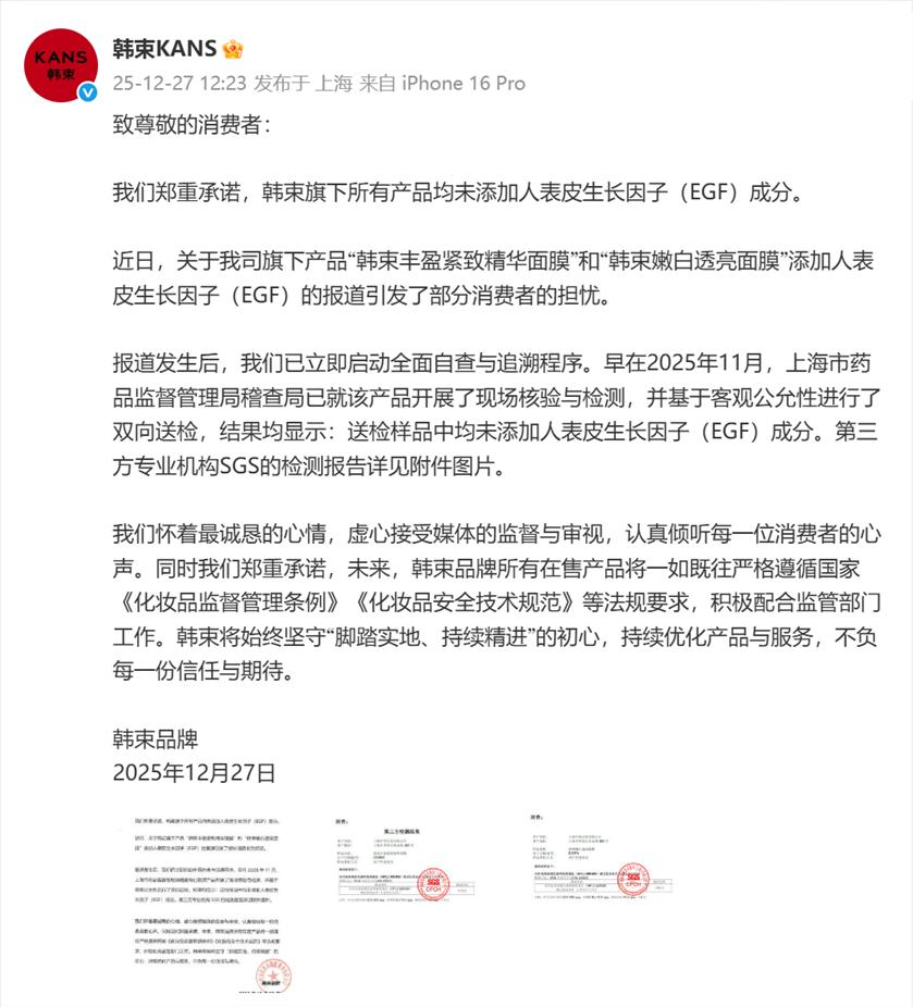12月27日,@韩束KANS发文称:我们郑重承诺,韩束旗下所有产品均未添加人表皮生长因子(EGF)成分。 近日,关于我司旗下产品“韩束丰盈紧致精华面膜”和“韩束嫩白透亮面膜”添加人表皮生长因子(EGF)的报道引发了部分消费者的担忧。 报道发生后,我们已立即启动全面自查与追溯程序。早在2025年11月,上海市药品监督管理局稽查局已就该产品开展了现场核验与检测,并基于客观公允性进行了双向送检,结果均显示:送检样品中均未添加人表皮生长因子(EGF)成分。第三方专业机构SGS的检测报告详见附件图片。 我们怀着最诚恳的心情,虚心接受媒体的监督与审视,认真倾听每一位消费者的心声。同时我们郑重承诺,未来,韩束品牌所有在售产品将一如既往严格遵循国家《化妆品监督管理条例》《化妆品安全技术规范》等法规要求,积极配合监管部门工作。韩束将始终坚守“脚踏实地、持续精进”的初心,持续优化产品与服务,不负每一份信任与期待。 ![]() 此前报道: 12月25日,据央视《经济半小时》栏目,记者将市面上多款热门化妆品送往具有检验资质的第三方检测机构进行检测。结果显示,在韩束丰盈紧致精华面膜中,检测出0.07pg/g的表皮生长因子;在另一款韩束嫩白透亮面膜中,这一数值更高,表皮生长因子达到3.21pg/g。 据悉,由于分子量较大,EGF在正常皮肤屏障条件下较难被吸收,一旦皮肤屏障功能不全,可能会引发其他潜在安全性问题。 基于有效性及安全性方面的考虑,2019年,国家药监局就在《化妆品监督管理常见问题解答》中明确指出:表皮生长因子不得作为化妆品原料使用。在配方中添加或者产品宣称含有表皮生长因子的,均属于违法产品。 资料显示,韩束于2003年由上美股份推出,专注于满足各年龄段亚洲女性不断变化的护肤诉求。2024年,该品牌收入同比增长80.9%至55.91亿元,在上美股份整体收入中的占比达82.3%。 |