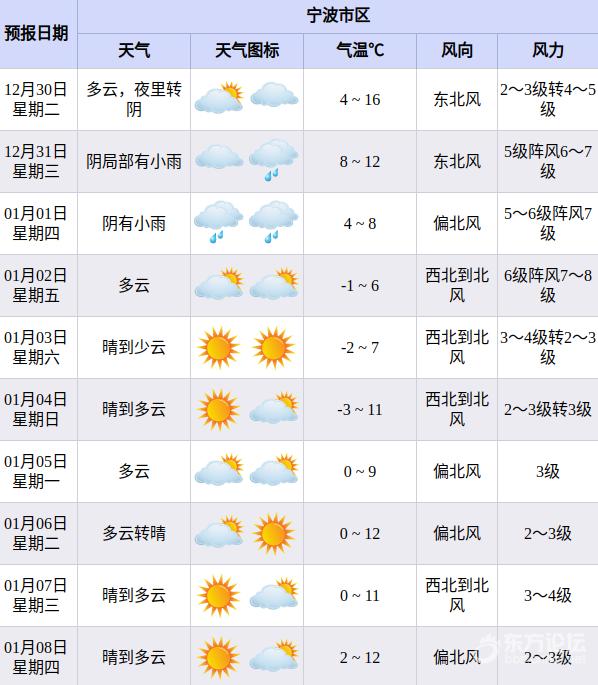 12月29日 宁波市防灾减灾救灾委员会办公室 发布工作提示单 ↓↓↓ 各区(县、市)、市直开发园区防减救灾办,市防减救灾委有关成员单位: 根据气象部门预报,元旦期间受较强冷空气影响,有一次大风、降温、弱降水和较严重冰冻过程,同时将出现今年入冬以来最低气温。30日夜里到2026年1月1日白天我市沿海海面有7~9级东北大风;1日夜里到2日沿海海面有8~10级、沿海地区和高海拔山区7~9级偏北大风。日平均气温过程降温幅度7℃~9℃;2日到4日最低气温-1℃~-4℃、有冰冻,山区-4℃~-8℃、有严重冰冻。海洋部门预报,预计30日夜里起,宁波海域将出现一次大风浪过程,影响最大时段在31日夜间到2026年1月2日宁波近岸海域将有2.0到3.0米的中到大浪;宁波近海海域将有3.5到4.5米的大到巨浪。为切实做好防范应对工作,现提示如下:
