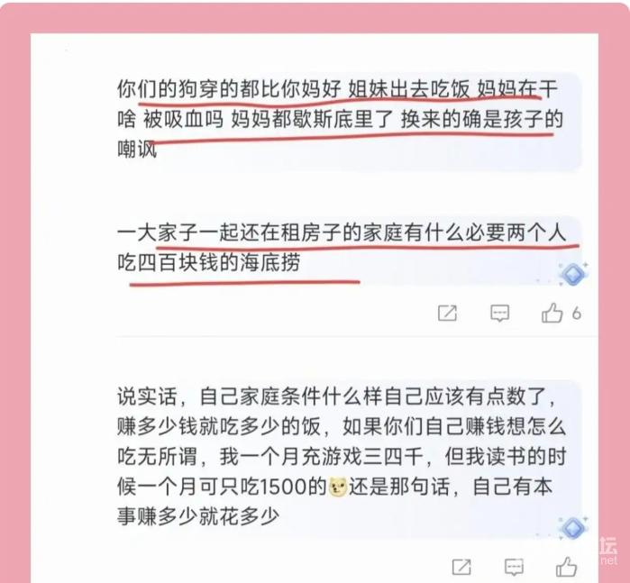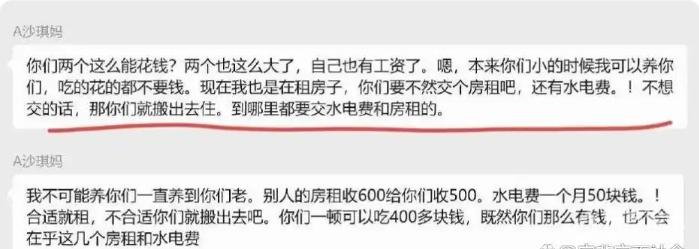 事情的起因很简单:刚毕业工作不久的大女儿,跟妹妹偷偷去吃了顿 400 元的海底捞,还在朋友圈晒了图。单亲妈妈看到后当场爆发,直接发消息要求女儿分摊房租和水电费,不然就搬出去住。