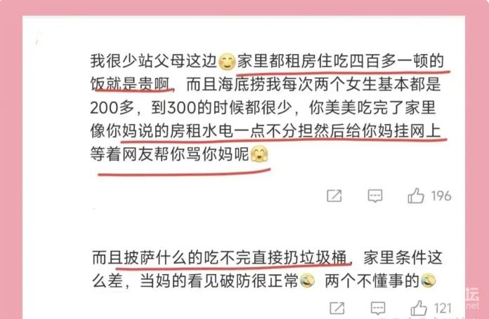 女儿觉得特别委屈,把聊天记录发到网上吐槽:“我刚工作没多少钱,吃顿好的怎么了?回家住还要交房租,这到底是不是我的家?” 一开始,网友们也跟着心疼女孩,觉得这位妈妈太斤斤计较,没必要为了一顿火锅逼女儿。