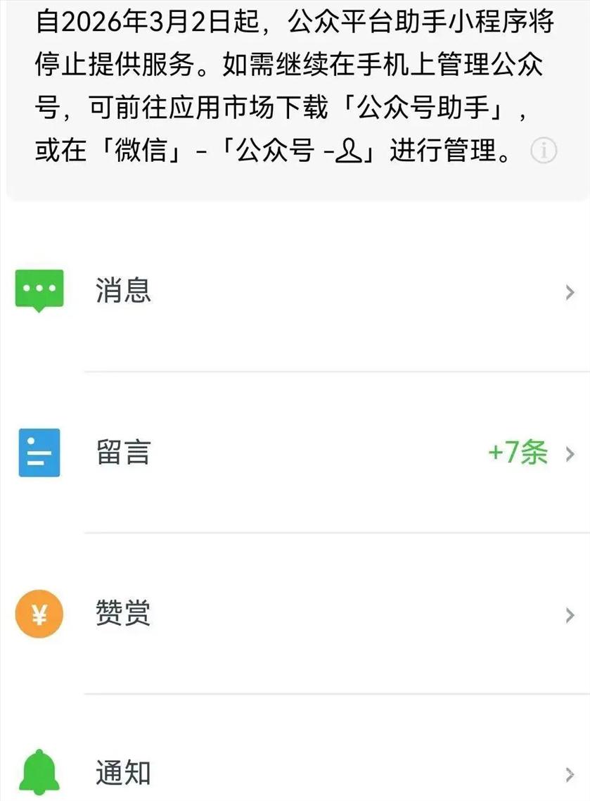 官方表示,如果用户需继续在手机上管理公众号,可前往应用市场下载“公众号助手”,或在“微信”“公众号”进行管理。