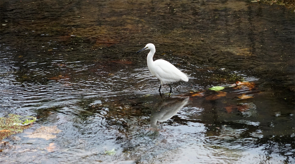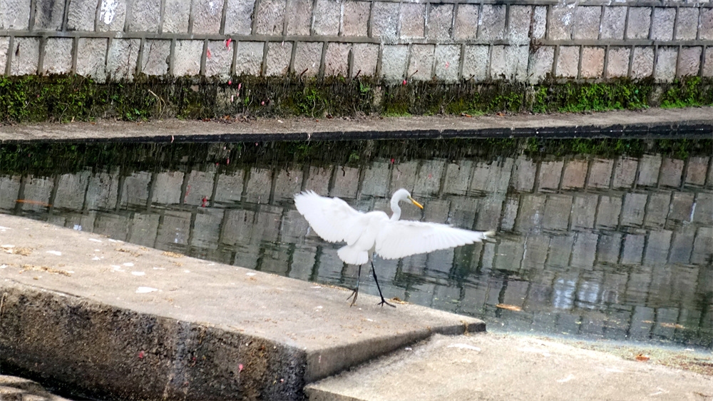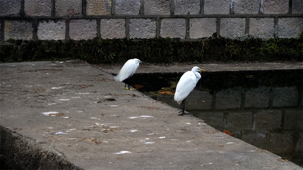 溪口镇上有2条河流自西向东流淌,穿镇而过:一条是河面宽阔的剡溪,宽度约有100米。另一条是名山江,虽然称之为“江”,但其宽度仅15米左右,只不过是一条小河沟。从去年下半年开始,干旱少雨,目前水量很少。名山江的上游,上白村附近,秋天的时候有20多只白鹭在水面上活动,它们在浅水处啄食小鱼小虾、浮游生物。