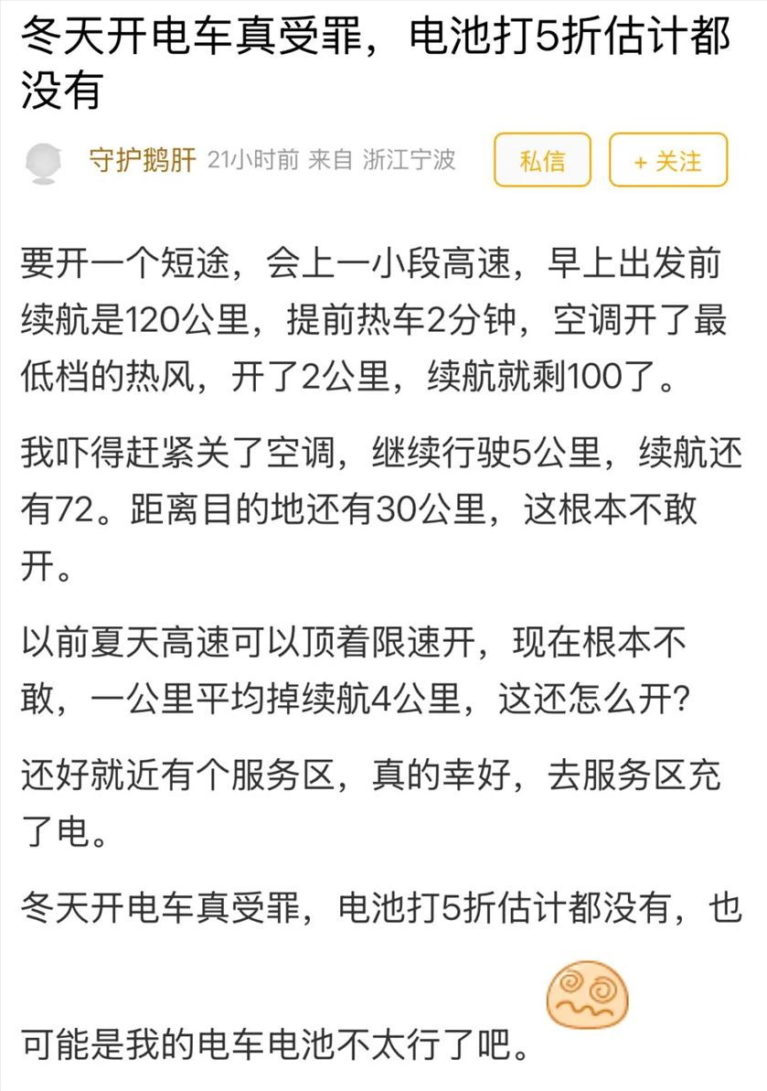 最近全国大降温,北方朋友晒雪景,南方朋友喊“湿冷魔法攻击”,而电车车主们,却在为同一件事抓狂——续航暴跌! 东论网友“守护鹅肝”就发帖称自己:早上出门时显示续航120公里,开了2公里直接掉到100,空调都不敢开,生怕下一秒就“趴窝”…… ![]() 该经车主的经历不是个例,翻翻社交平台,电车车主们的“控诉”能刷满屏: ![]() ![]() 截图自小红书平台; 东论上也有网友留言称必须每天充!晚上回家第一件事就是插枪,不然第二天根本不敢出门。 ![]() 不过,也有网友觉得冬天开空调,电池电量才会下降的快; ![]() ![]() 当然,也有“人间清醒”网友提醒:你这掉电太夸张,建议检查电池 ![]() ![]() 不过也有网友评论:天气一冷,就连手机都扛不住,何况电车? ![]() 那么,电车冬天为何续航暴跌?核心原因是锂电池“怕冷”。低温下,电池内部化学反应变慢,能释放的电量减少(就像人冻僵了,动作变慢)。另外就如网友所言,空调也是“续航刺客”,开暖风、座椅加热,甚至电池自身需要加热维持工作温度,这些都会额外消耗电量。 小东君也是上网找了一些冬天开电车的“保命技巧”,大家可以了解一下: 提前规划充电路线:出发前用导航查好沿途充电桩,避免“续航焦虑”变“抛锚焦虑”。 暖风别开太猛:温度调低(20℃左右)、风量调小,或用座椅加热代替(耗电更低)。 减少急加速/急刹车:温柔驾驶能降低能耗,续航多撑几公里。 定期检查电池健康:如果续航突然暴跌,可能是电池老化或故障,及时去4S店检测。 最后说句大实话:电车冬天续航打折是物理规律,但打5折甚至更多,确实夸张。如果你的车也这样,别急着骂“电车不行”,先检查电池状态——毕竟,谁也不想被撂在高速上等救援啊! 你冬天开电车掉电严重吗? 欢迎留言讨论 |